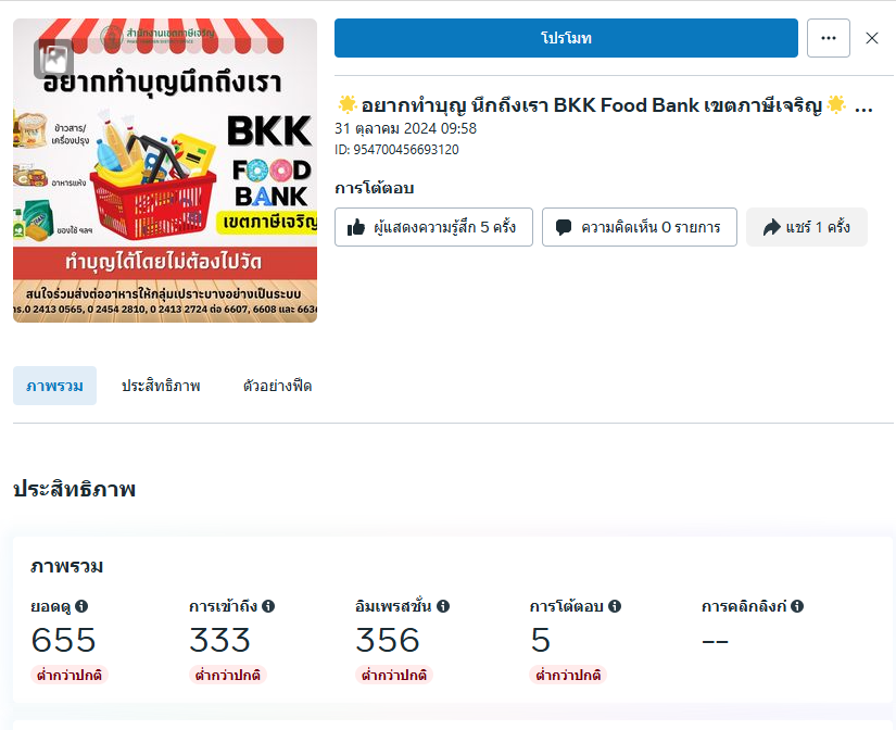 ![]() | 26-11-2024 | 660.00 | ![]() | จัดทำสื่อประชาสัมพันธ์ อินโฟกราฟิกเปิดรับบริจาคของ BKK Food Bank ผ่านช่องทาง Facebook สำนักงานเขตภาษีเจริญ เมื่อวันที่ 31 ตุลาคม 2567 จำนวนการมีส่วนร่วมกับสื่อประชาสัมพันธ์ที่เผยแพร่ (Engagement) = 660 | |