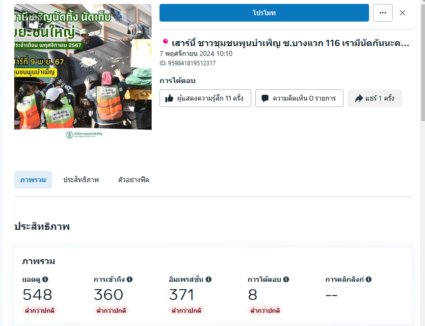 ![]() | 26-11-2024 | 556.00 | ![]() | จัดทำสื่อประชาสัมพันธ์ อินโฟกราฟิกเก็บขยะชิ้นใหญ่ชุมชนพูนบำเพ็ญ ผ่านช่องทาง Facebook สำนักงานเขตภาษีเจริญ เมื่อวันที่ 7 พฤศจิกายน 2567 จำนวนการมีส่วนร่วมกับสื่อประชาสัมพันธ์ที่เผยแพร่ (Engagement) = 556 | |