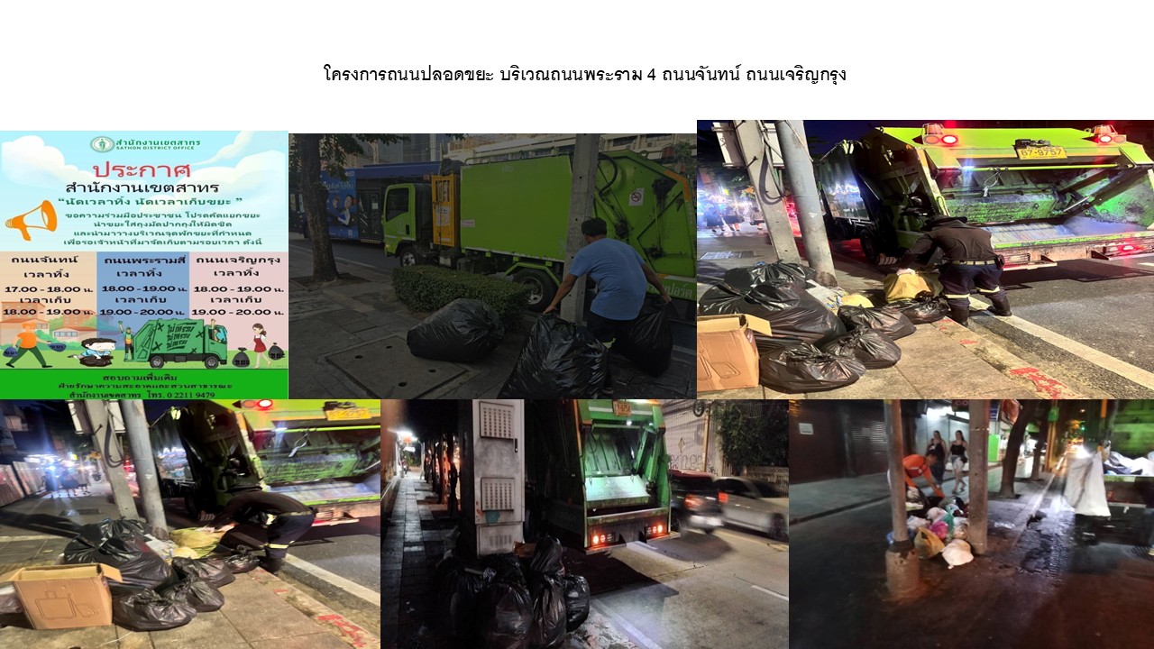 ![]() | 27-08-2025 | 1.00 | โครงการถนนน่ามองปลอดถุงขยะ นำขยะใส่ถุงมัดปากถุงให้มิดชิดและนำมาวางบริเวณจุดพักขยะที่กำหนด บริเวณถนนพระรามสี่ กำหนดเวลาทิ้ง 18.00-19.00น. เวลาเก็บ 19.00-20.00น. บริเวณถนนจันทน์ กำหนดเวลาทิ้ง 17.00 น.-18.00น. เวลาเก็บ 18.00 น.-19.00 น. บริเวณถนนเจริญกรุง กำหนดเวลาทิ้ง 18.00 น.-19.00น. เวลาเก็บ 19.00น.-20.00 น. | ||