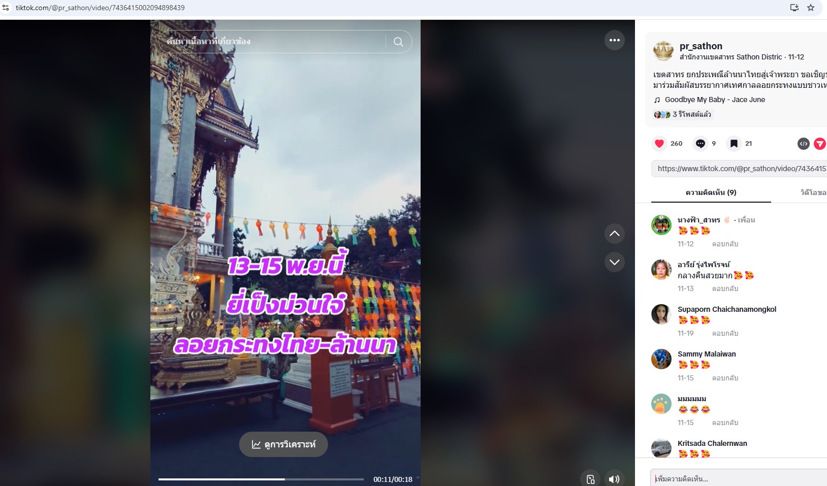| 19-11-2024 | 1.00 |  | สำนักงานเขตสาทร ดำเนินการผลิตสื่อประชาสัมพันธ์ ประเภท คลิปวิดีโอสั้น " ?????ขอเชิญชวนมาเที่ยวงาน ยี่เป็ง ม่วนใจ๋ ลอยกระทงไทย - ล้านนา กันครับ? " เผยแพร่ผ่านแพลตฟอร์ม TikTok เมื่อวันที่ 12 พฤศจิกายน 2567 | |