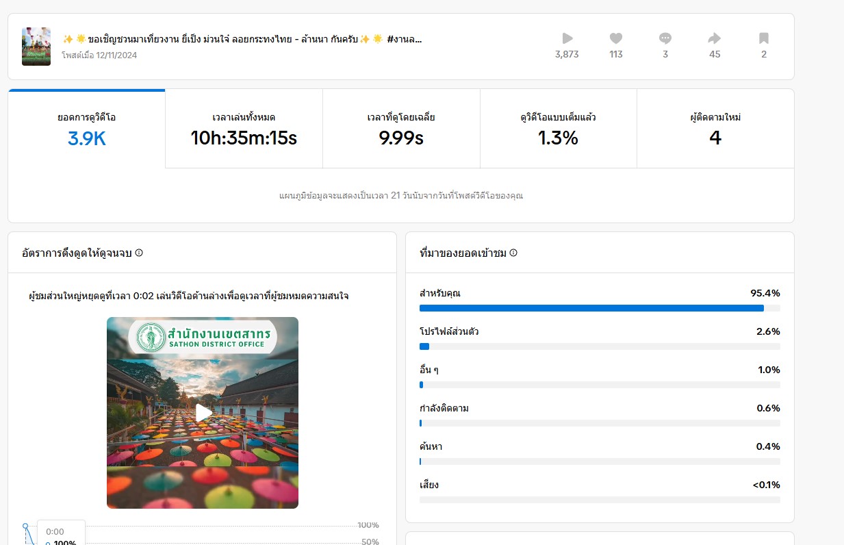 เผยแพร่ผ่านแพลตฟอร์ม TikTok เมื่อวันที่ 12/6/68 มียอดเข้าชมวิดีโอ 872 ยอดกดหัวใจ 61 ยอดคอมเม้นท์ 5 ยอดแชร์ 4 รวม 942 | |