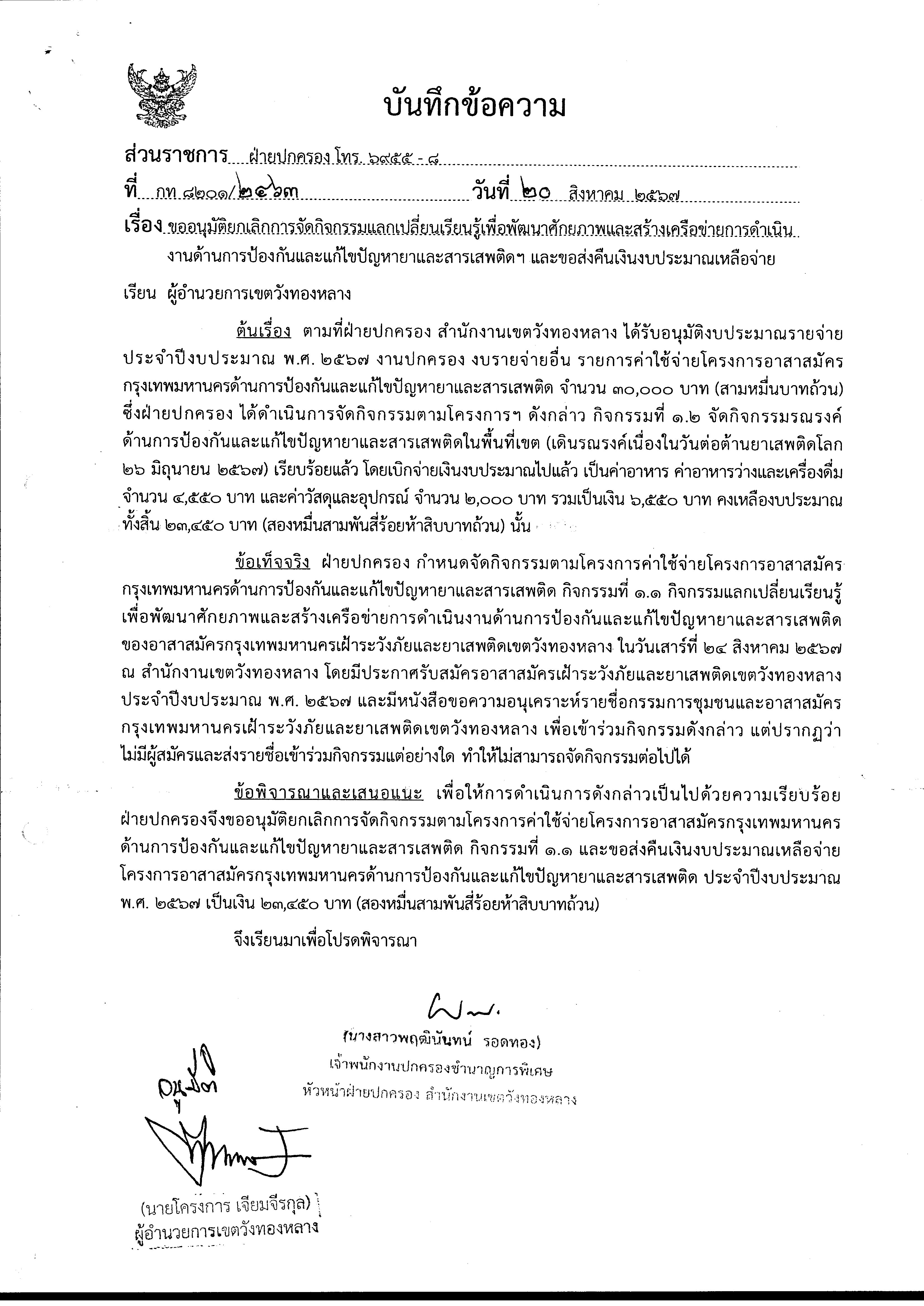 30-08-20240.00ยกเลิกการจัดโครงการอาสาสมัครกรุงเทพด้านการป้องกันและแก้ไขปัญหายาเสพติด กิจกรรมที่ 1.1 กิจกรรมแลกเปลี่ยนเรียนรู้เพื่อพัฒนาศักยภาพและสร้างเครือข่ายการดำเนินงานด้านการป้องกันและแก้ไขปัญหายาเสพติดของอาสาสมัครกรุงเทพมหานครเฝ้าระวังภัยและยาเสพติดของเขตวังทองหลาง ปรากฏว่าไม่มีผู้สมัครเข้าร่วมกิจกรรมแต่อย่างใด ทำให้ไม่สามารถจัดกิจกรรมต่อไปได้ และผู้อำนวยการเขตวังทองหลางได้อนุมัติยกเลิกการจัดกิจกรรมดังกล่าวแล้ว