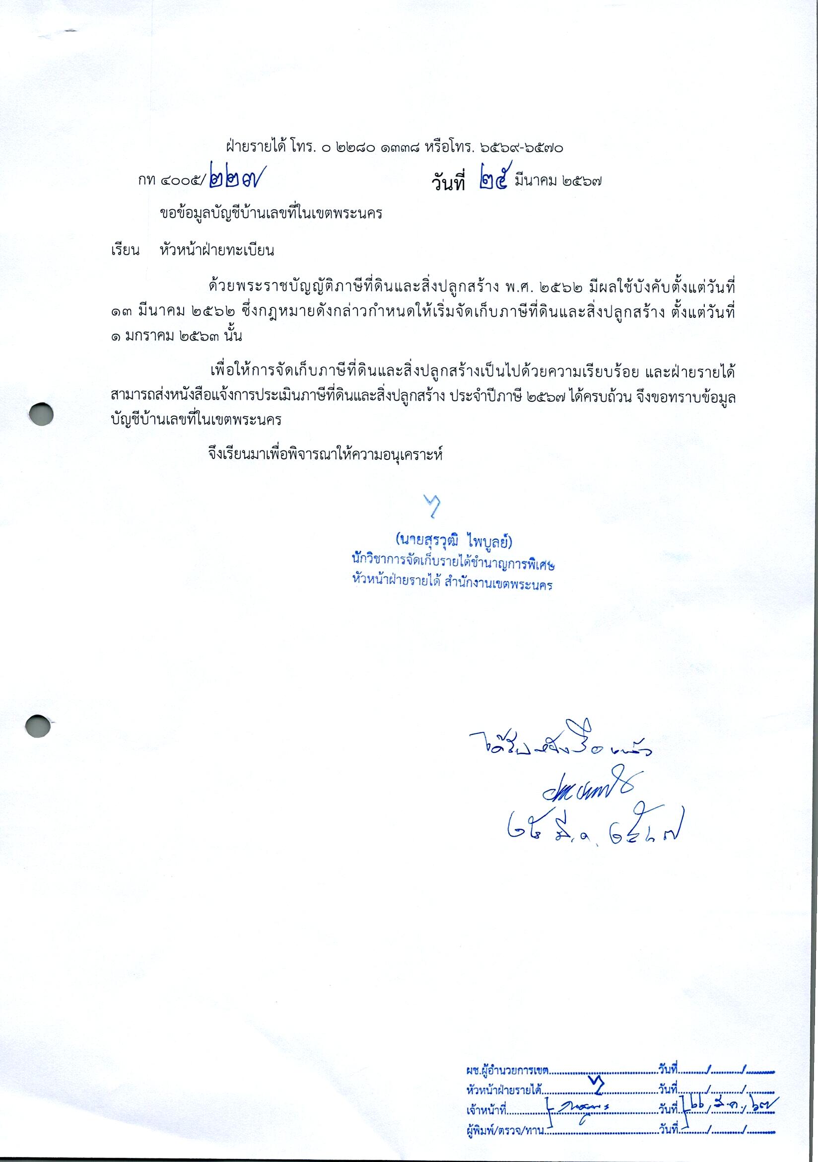 ![]() | 25-09-2025 | 0.00 | ฝ่ายรายได้ สำนักงานเขตพระนคร ได้ดำเนินการประสานฝ่ายทะเบียน เพื่อขอข้อมูลบัญชีบ้านเลขที่ในเขตพระนคร ตามหนังสือที่ กท4005/227 ลงวันที่ 25 มีนาคม 2567 ซึ่งในพื้นที่ของเขตพระนครมิได้มีอาคารชุดที่มีการจดทะเบียนเพิ่มเติมขึ้นใหม่หลังจากที่มีการประสานงานแล้ว และได้ดำเนินการนำเข้าข้อมูล House ID ของอาคารชุด ใน BMA TAX จำนวน 213 เลขหมาย ครบถ้วนแล้ว ณ เดือนกุมภาพันธ์ 2568 | ||