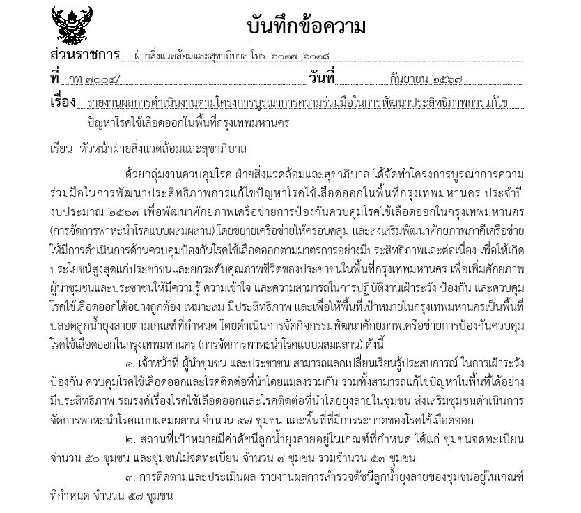 6 | สรุปและจัดทำรายงานผลการดำเนินการเพื่อนำเสนอผู้บริหารและแจ้งผลให้สำนักอนามัยทราบ | 10.00 | 01-10-2023 | 30-09-2024 |