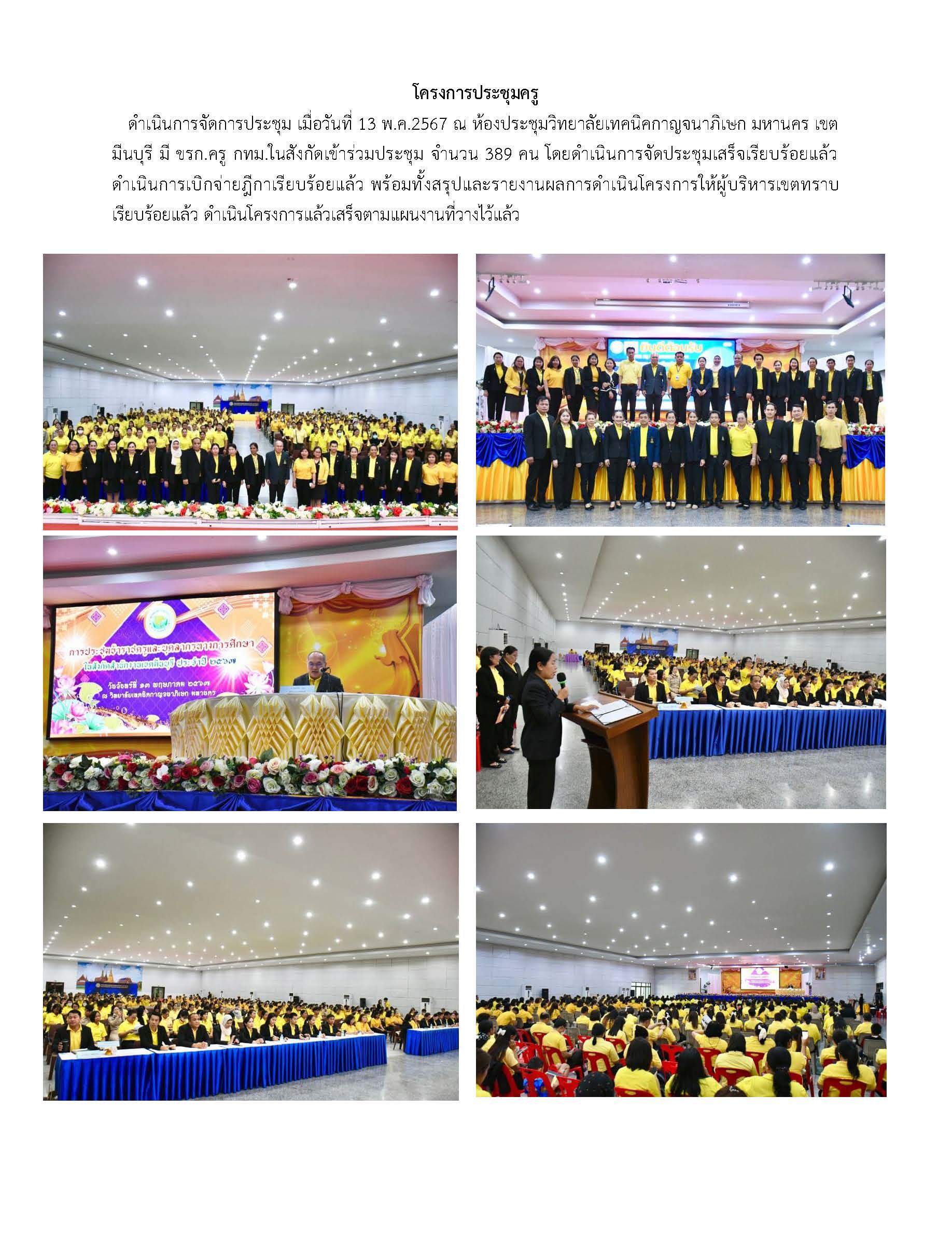 24-05-202440.001. จัดการประชุม เมื่อวันที่ 13 พ.ค.2567 ณ ห้องประชุมวิทยาลัยเทคนิคกาญจนาภิเษก มหานคร เขตมีนบุรี มี ขรก.ครู กทม.ในสังกัดเข้าร่วมประชุม จำนวน 389 คน โดยดำเนินการจัดประชุมเสร็จเรียบร้อยแล้ว 2. ดำเนินการเบิกจ่ายฎีกาเรียบร้อยแล้ว 3. สรุปและรายงานผลการดำเนินโครงการให้ผู้บริหารเขตทราบเรียบร้อยแล้ว ดำเนินโครงการแล้วเสร็จตามแผนงานที่วางไว้แล้ว