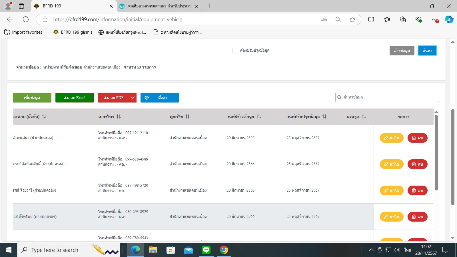 ![]() | 23-07-2025 | 0.00 | ![]() | ดำเนินการปรับปรุงข้อมูลยานพาหนะในระบบสารสนเทศภูมิศาสตร์(GIS) และระบบการบริหาร (MIS) โดยแก้ไขและอัปเดตฐานข้อมูลซึ่งมีข้อมูลที่ซ้ำกันจึงได้มีการแก้ไขจำนวนแล้ว ข้อมูล ณ วันที่ 23 กรกฎาคม 2568 จำนวนยานพาหนะที่สามารถนำมาใช้สนับสนุนงานป้องกันและบรรเทาสาธารณภัยที่อยู่ในความรับผิดชอบของสำนักงานเขตดอนเมือง มีจำนวนทั้งสิ้น 56 คัน ใช้งานได้ จำนวน 56 คัน ไม่พร้อมใช้งาน จำนวน 0 คัน |