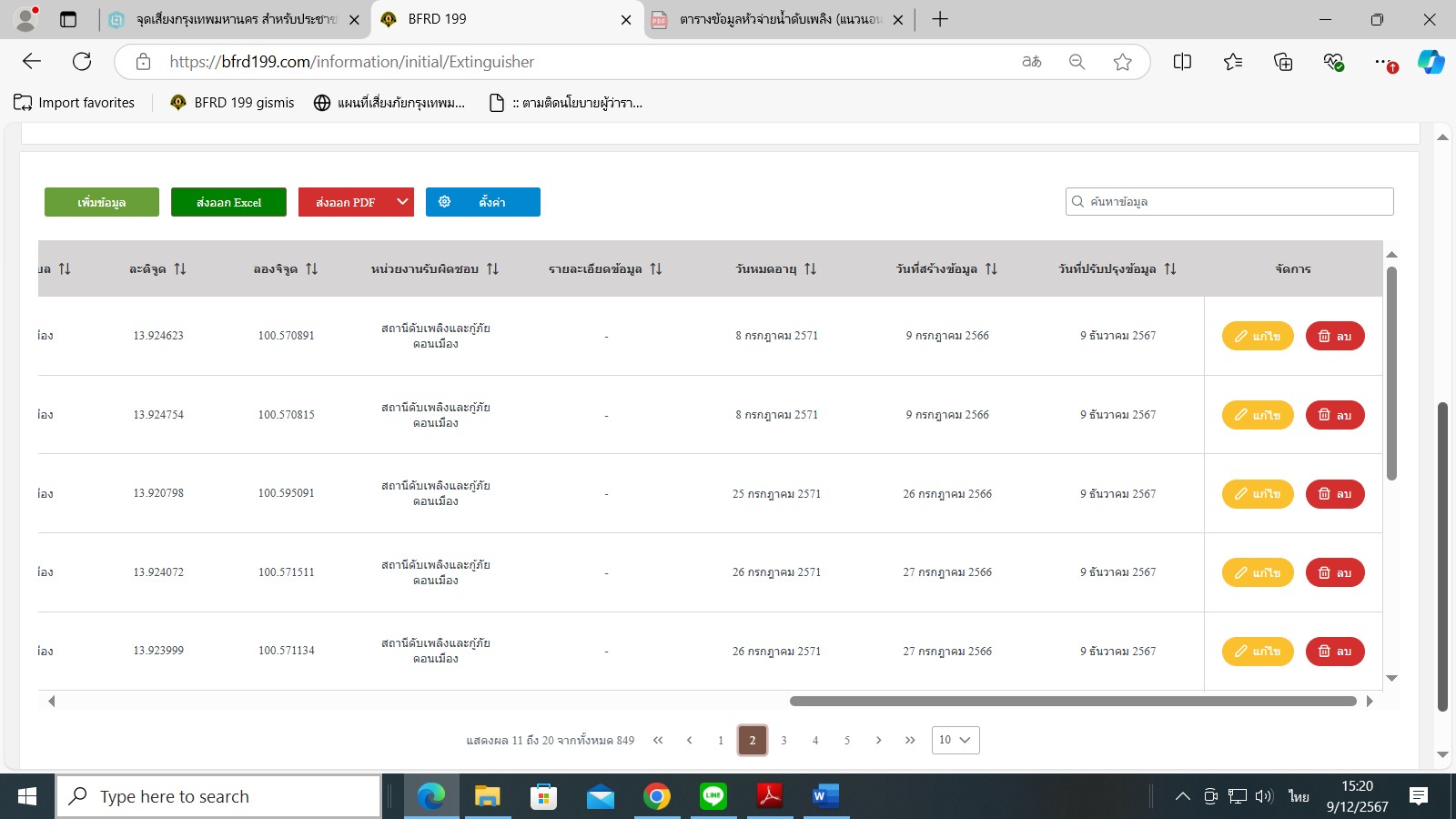 ![]() | 25-09-2025 | 0.00 | ![]() | รายงานสถานะรายเดือน ผ่านระบบระบบฐานข้อมูลสารสนเทศภูมิศาสตร์ (GIS) และระบบสารสนเทศการบริหาร (MIS) มีถังดับเพลิงแบบยกหิ้วที่อยู่ในความรับผิดชอบของสำนักงานเขตดอนเมือง มีจำนวนทั้งสิ้น 1,204 ถัง ใช้งานได้จำนวน 1,063 ถัง ไม่พร้อมใช้งานหรือชำรุด จำนวน 141 ถัง | |
