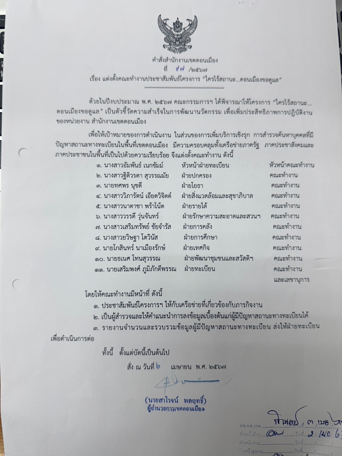 30-09-20240.00แต่งแต่งคณะทำงานประชาสัมพันธ์โครงการ "ใครไร้สถานะ..ดอนเมืองขอดูแล" ณ วันที่ 2 เมษายน 2567