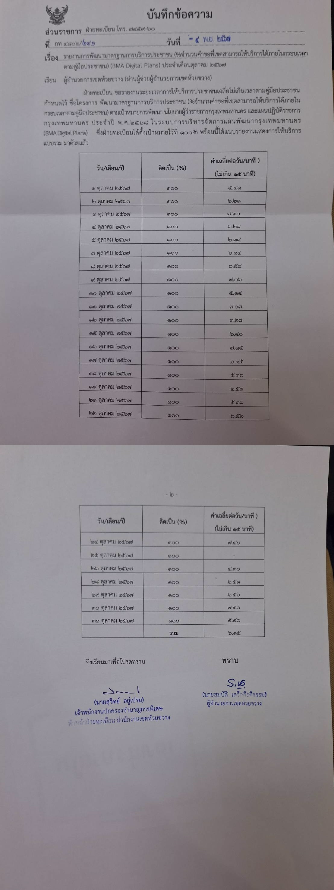 ![]() | 25-09-2025 | 72.36 | สำนักงานเขตห้วยขวาง ดำเนินการตามมาตรฐานการบริการประชาชน ภายในระยะเวลาที่กำหนด คิดเป็นร้อยละ 72.36 โดยแบ่งเป็นผลการดำเนินงานในระบบ BMA OSS 32 กระบวนงาน ตั้งแต่ ธ.ค. 67 ถึง 25 ก.ย. 68 คิดเป็นร้อยละ 58.29 และมีผลการดำเนินงานในการทำบัตรประชาชนที่จองคิวล่วงหน้าผ่านระบบ BMAQ ได้ภายในเดือนกันยายน 2568 คิดเป็นร้อยละ 86.43 | ||