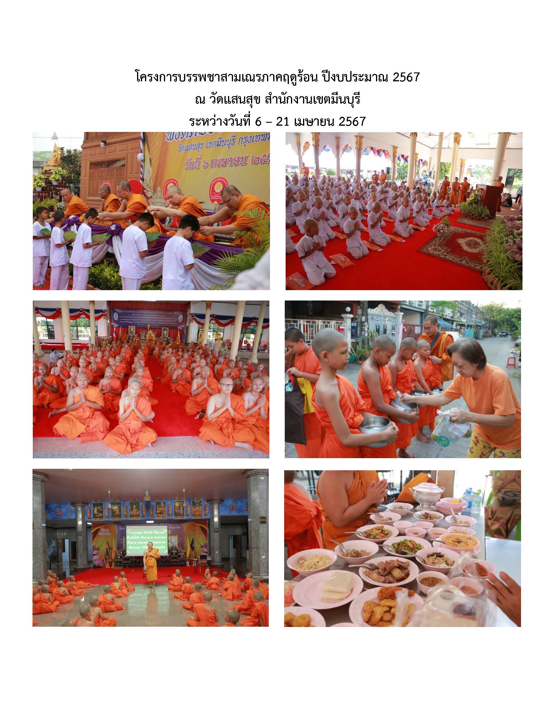 25-04-202430.001. จัดงานบรรพชาสามเณรภาคฤดูร้อน เมื่อวันที่ 6-21 เมษายน 2567 ณ วัดแสนสุข มีสามเณรเข้ารับการบรรพชา จำนวน 110 รูป ลาสิกขาไปแล้วเมื่อวันที่ 21 เมษายน 2567 ดำเนินโครงการแล้วเสร็จตามแผนงานที่วางไว้เรียบร้อยแล้ว 2. อยู่ระหว่างการจัดทำฎีกา และเบิกจ่ายโครงการบรรพชาสามเณรภาคฤดูร้อน 3. อยู่ระหว่างสรุปและประเมินผลรายงานผลการดำเนินงานโครงการ
