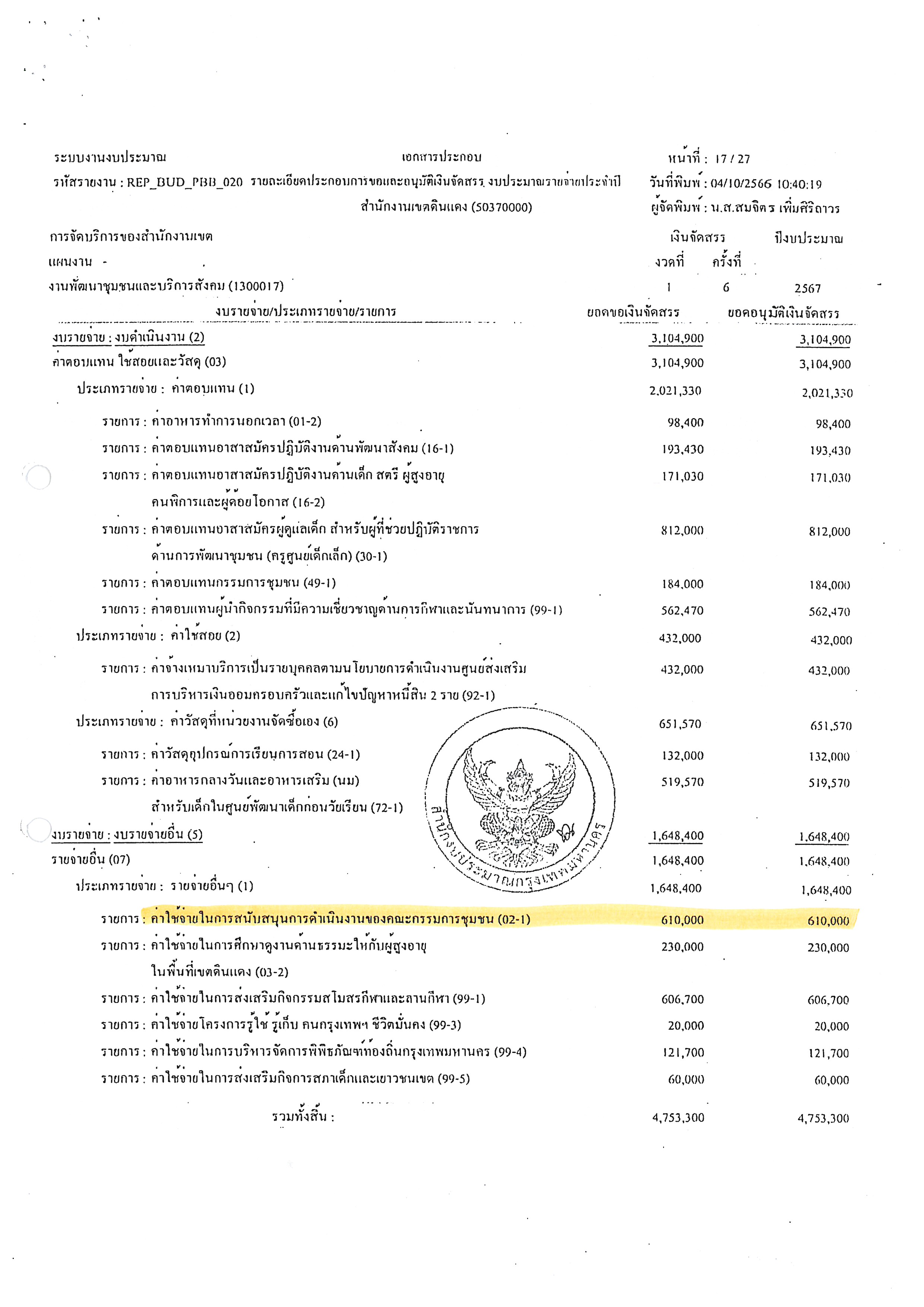 11-09-20240.00ได้รับอนุมัติงบประมาณรายจ่ายประจำปีงบประมาณ พ.ศ. 2567 งวดที่ 1 ครั้งที่ 6 ตามหนังสือสำนักงบประมาณ ที่ กท 1903/240 ลงวันที่ 10 ตุลาคม 2566