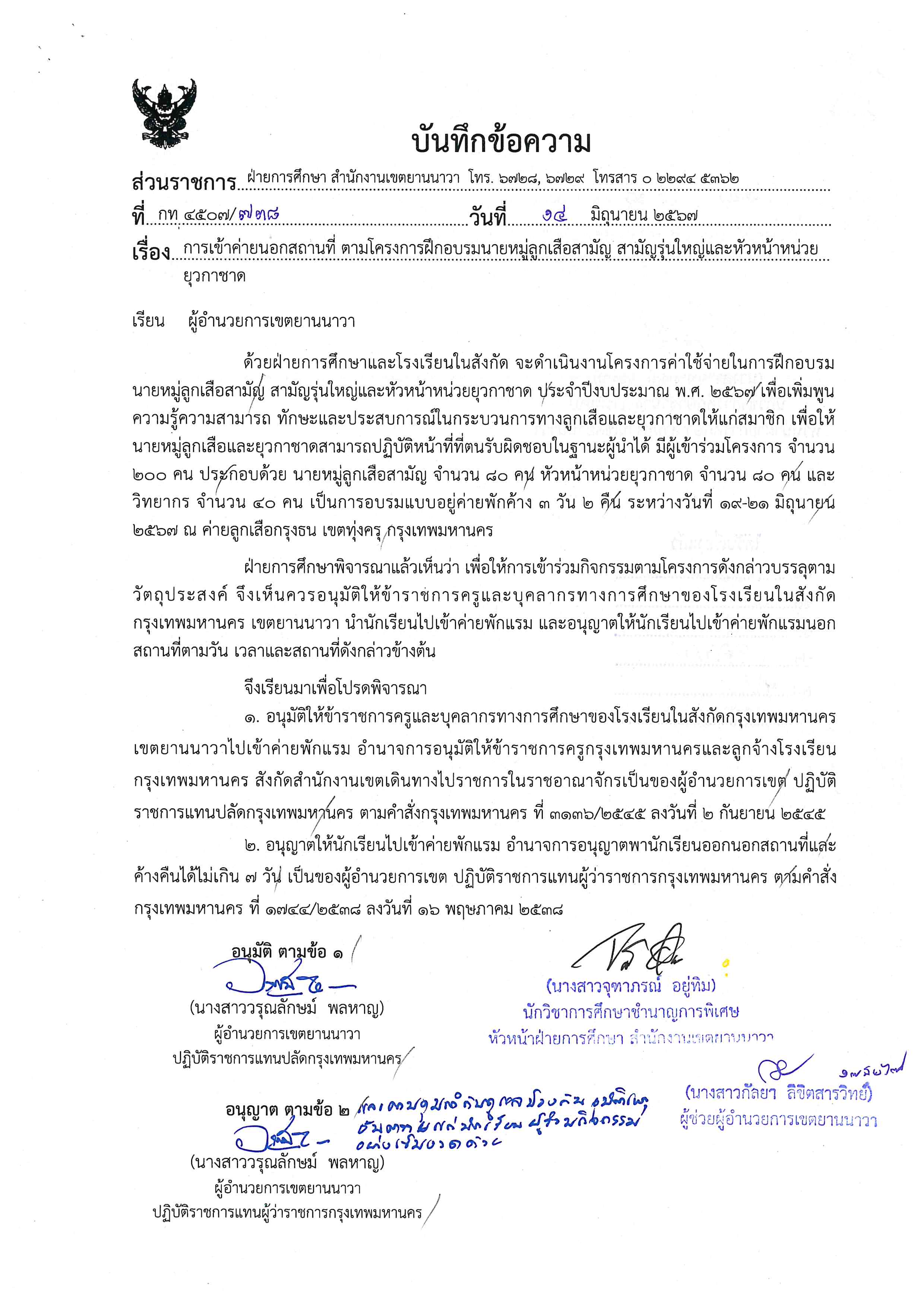 ![]() | 20-09-2024 | 15.00 | ทำหนังสือขออนุญาตและอนุมัติให้นักเรียนข้าราชการครูเข้าร่วมกิจกรรม | ||