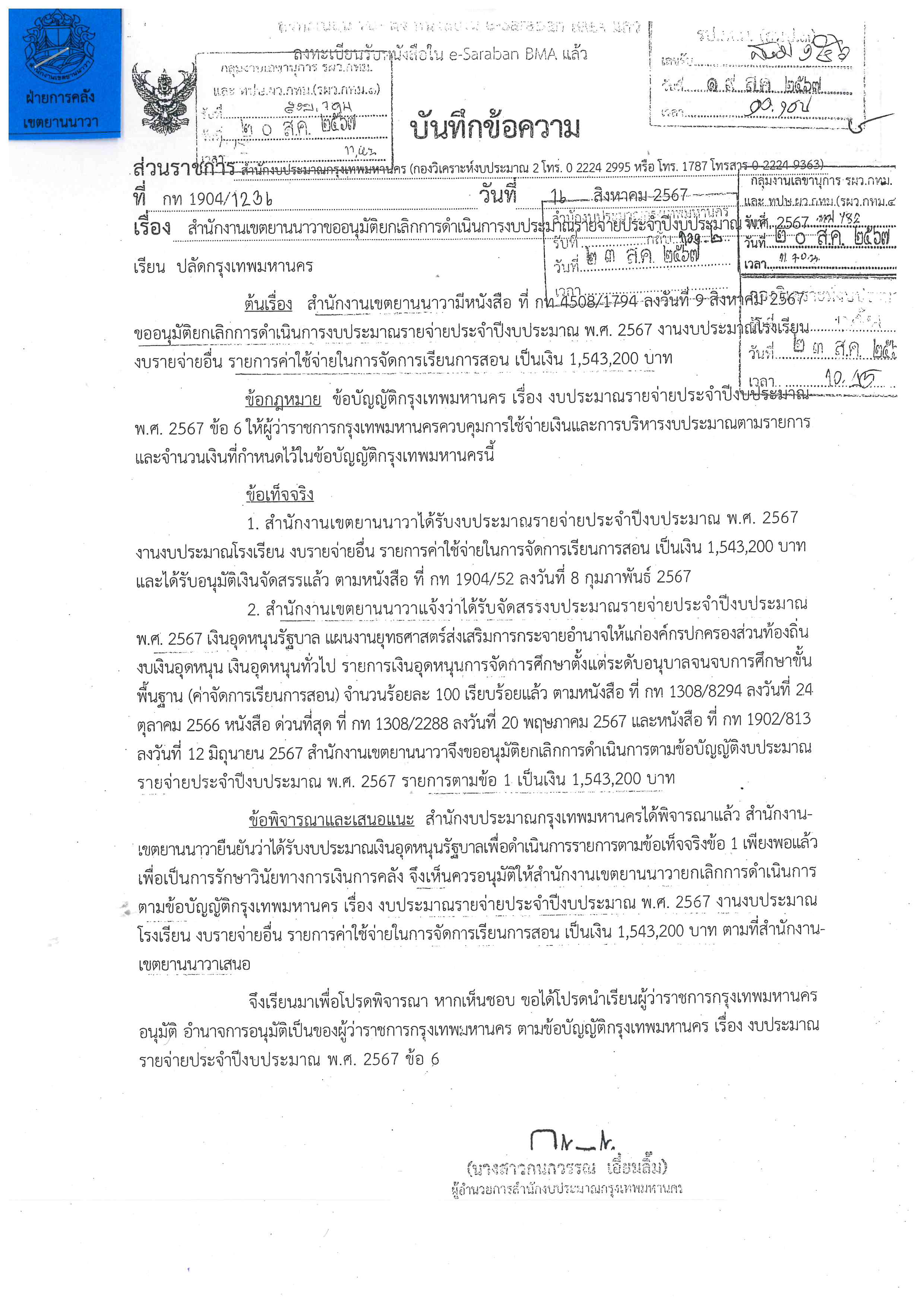 18-09-20240.00ยกเลิกการดำเนินการตามหนังสือสำนักงบประมาณกรุงเทพมหานคร ที่ กท 1904/1236 ลงวันที่ 16 สิงหาคม 2567 เรื่อง สำนักงานเขตยานนาวาขออนุมัติยกเลิกการดำเนินการงบประมาณรายจ่ายประจำปีงบประมาณ พ.ศ. 2567