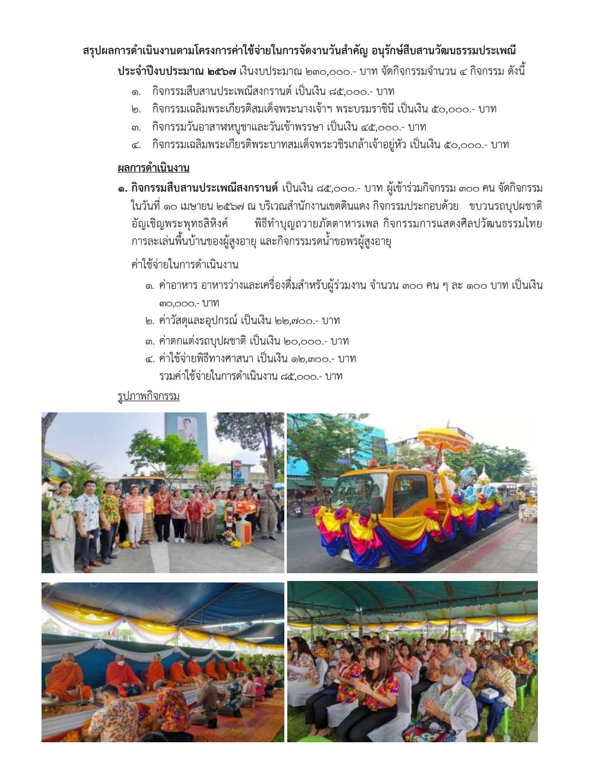 04-09-20245.00สรุปผลการดำเนินโครงการค่าใช้จ่ายในการจัดงานวันสำคัญอนุรักษ์สืบสานวัฒนธรรมประเพณี ประจำปีงบประมาณ 2567 เงินงบประมาณ 230,000.- บาท จัดกิจกรรมจำนวน 4 กิจกรรม ดังนี้ 1. กิจกรรมสืบสานประเพณีสงกรานต์ เป็นเงิน 85,000.- บาท ผู้เข้าร่วมกิจกรรม 300 คน จัดกิจกรรมในวันที่ 10 เมษายน 2567 ณ บริเวณสำนักงานเขตดินแดง กิจกรรมประกอบด้วย ขบวนรถบุปผชาติอัญเชิญพระพุทธสิหิงค์ พิธีทำบุญถวายภัตตาหารเพล กิจกรรมการแสดงศิลปวัฒนธรรมไทย การละเล่นพื้นบ้านของผู้สูงอายุ และกิจกรรมรดน้ำขอพรผู้สูงอายุ 2. กิจกรรมเฉลิมพระเกียรติสมเด็จพระนางเจ้าฯ พระบรมราชินี เป็นเงิน 50,000.- บาท ผู้เข้าร่วมกิจกรรม 300 คน จัดกิจกรรมในวันที่ 31 พฤษภาคม 2567 ณ สำนักงานเขตดินแดง กิจกรรมประกอบด้วย พิธีทำบุญตักบาตรและถวายภัตตาหารเพล เพื่อถวายเป็นพระราชกุศล พิธีถวายพระพรชัยมงคล และลงนามถวายพระพร 3. กิจกรรมวันอาสาฬหบูชาและวันเข้าพรรษา เป็นเงิน 45,000.- บาท ผู้เข้าร่วมกิจกรรม 300 คน จัดกิจกรรมในวันที่ 18 กรกฎาคม 2567 กิจกรรมประกอบด้วย ขบวนอัญเชิญเทียนจำนำพรรษา พร้อมขบวนกลองยาว ฟังบรรยายธรรมเทศนาและถวายเทียนจำนำพรรษา ณ วัดพรหมวงศารามและวัดกุนนทีรุทธาราม เขตดินแดง 4. กิจกรรมเฉลิมพระเกียรติพระบาทสมเด็จพระวชิรเกล้าเจ้าอยู่หัว เป็นเงิน 50,000.- บาท ผู้เข้าร่วมกิจกรรม 500 คน จัดกิจกรรมในวันที่ 25 กรกฎาคม 2567 ณ สำนักงานเขตดินแดง กิจกรรมประกอบด้วยพิธีทำบุญถวายภัตตาหารเพล เพื่อถวายเป็นพระราชกุศล พิธีถวายเครื่องราชสักการะและวางพานพุ่ม พิธีถวายพระพรชัยมงคลและลงนามถวายพระพร