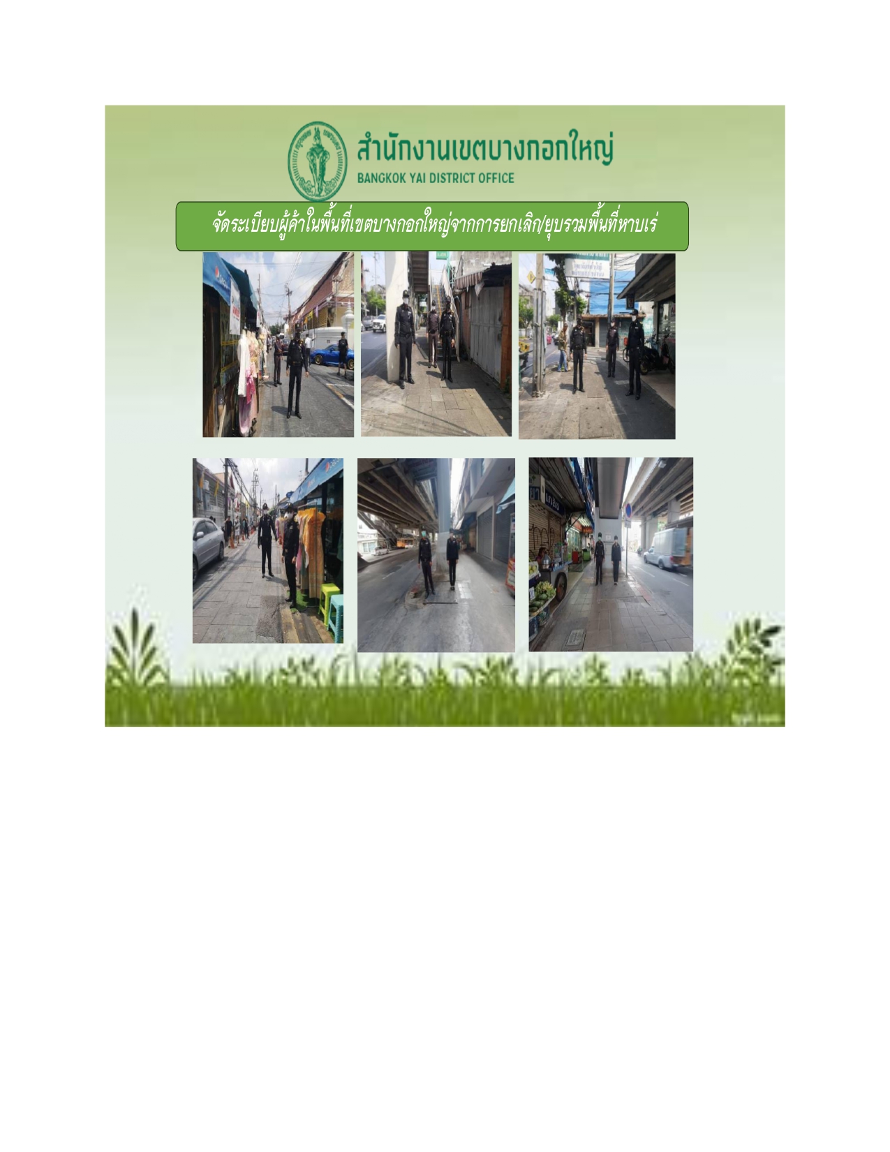 25-04-20241.00ดำเนินการตามเป้าหมาย 1 จุด ยกเลิกพื้นที่หาบเร่แผงลอยนอกจุดผ่อนผัน ทั้งหมด 5 จุด ประกอบด้วยบริเวณ 1. ถนนอรุณอมรินทร์ 2. ถนนอิสรภาพ 3. ซอยพาณิชยการธนบุรี 4. ถนนรัชดาภิเษก-จรัญสนิทวงศ์ 5. ถนนเพชรเกษม ในวันที่ 30 ธันวาคม พ.ศ. 2566 และดำเนินการตรวจพื้นที่เพื่อเป็นการจัดระเบียบผู้ค้าภายในพื้นที่เขต