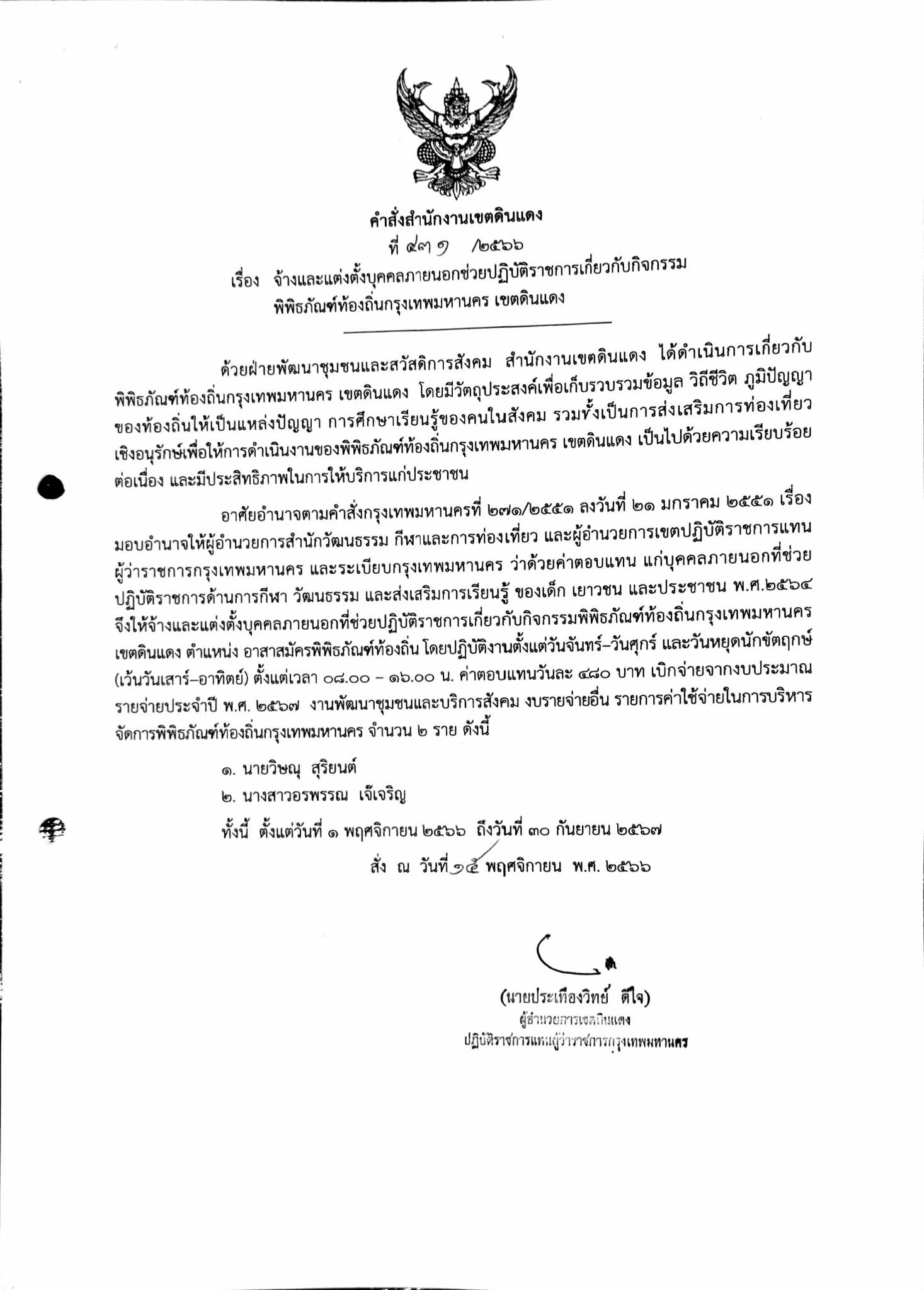 04-09-202460.00จ้างอาสาสมัครพิพิธภัณฑ์จำนวน 2 ราย ได้แก่ 1. นายวิษณุ สุริยนต์ 2. นางสาวอรพรรณ เจ๊เจริญ ตามคำสั่งสำนักงานเขตดินแดงที่ 431/2566 ลว 15 พ.ย. 2566