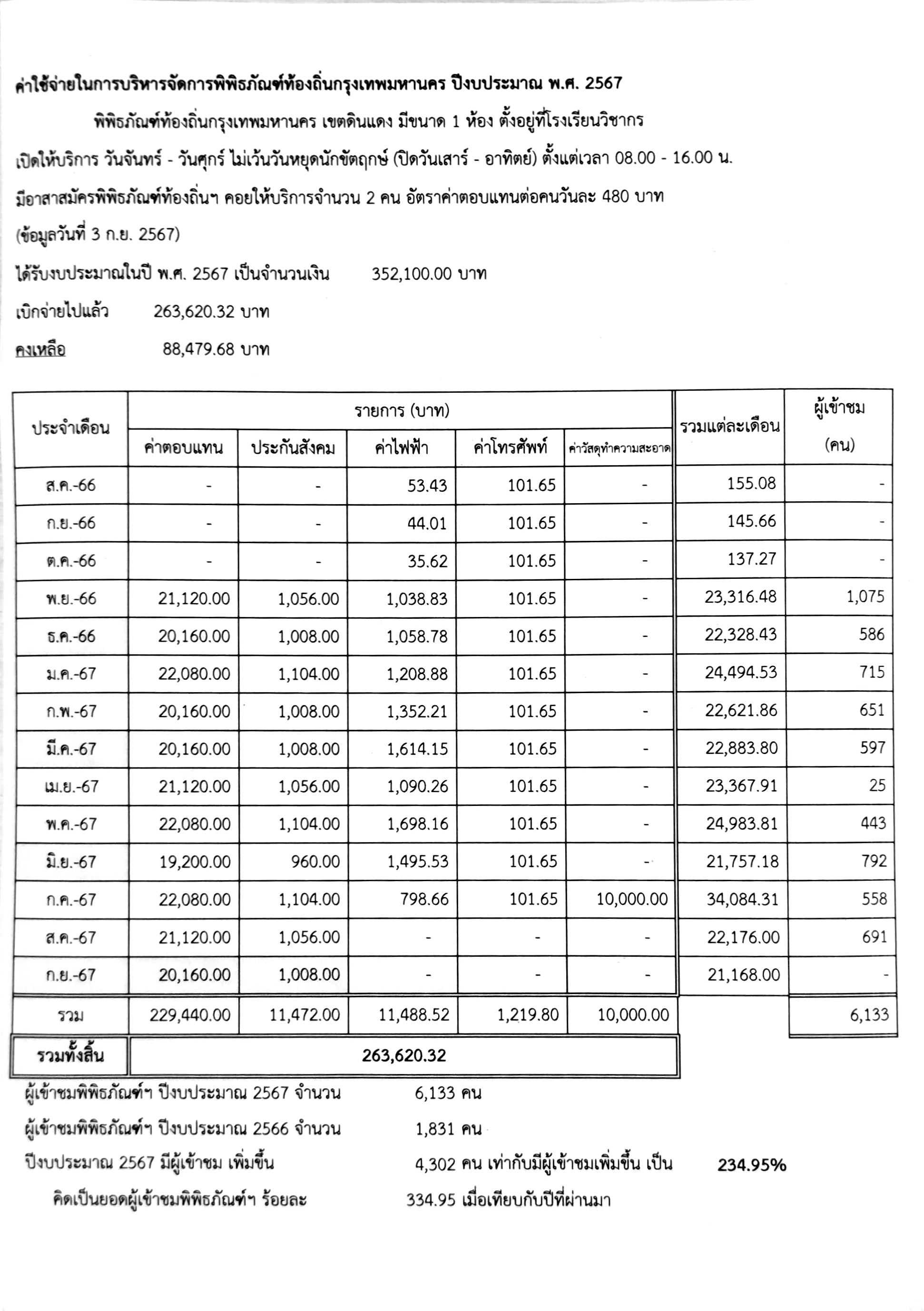 13-09-202440.00เบิกจ่ายงบประมาณ เป็นจำนวนทั้งสิ้น 263,620.32 บาท สถิติยอดผู้เข้าชมสะสม รวม 6,133 คน คิดเป็นร้อยละ 334.95% เมื่อเทียบกับยอดผู้เข้าชมปีงบประมาณที่ผ่านมา