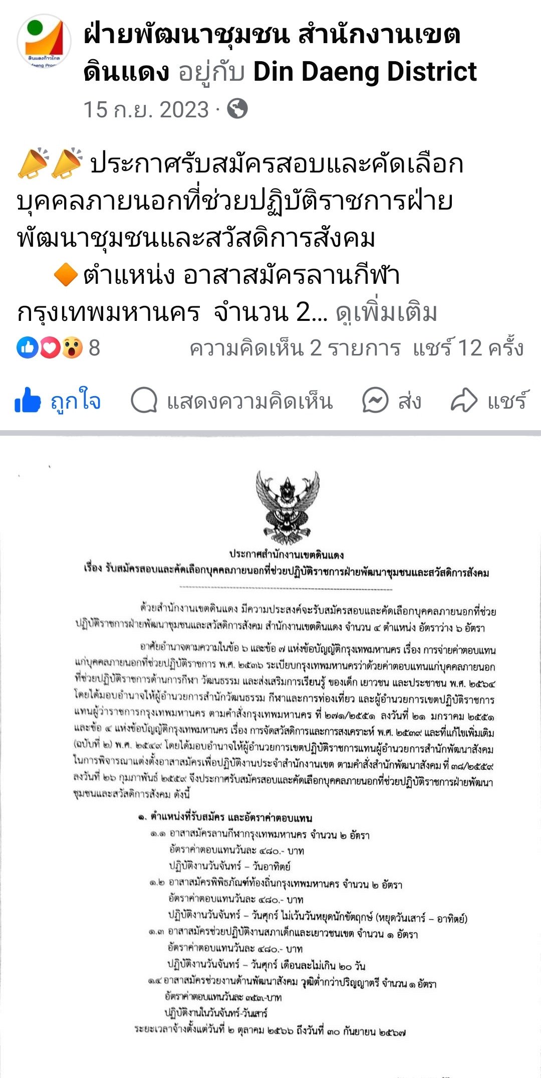 11-09-202415.00ประกาศรับสมัครอาสาสมัครช่วยปฏิบัติงานสภาเด็กและเยาวชนเขตดินแดง จำนวน 1 อัตรา ครั้งที่ 2 ระหว่างวันที่ 2 - 18 ตุลาคม 2566 ปรากฎว่า ไม่มีผู้สนใจมาสมัคร