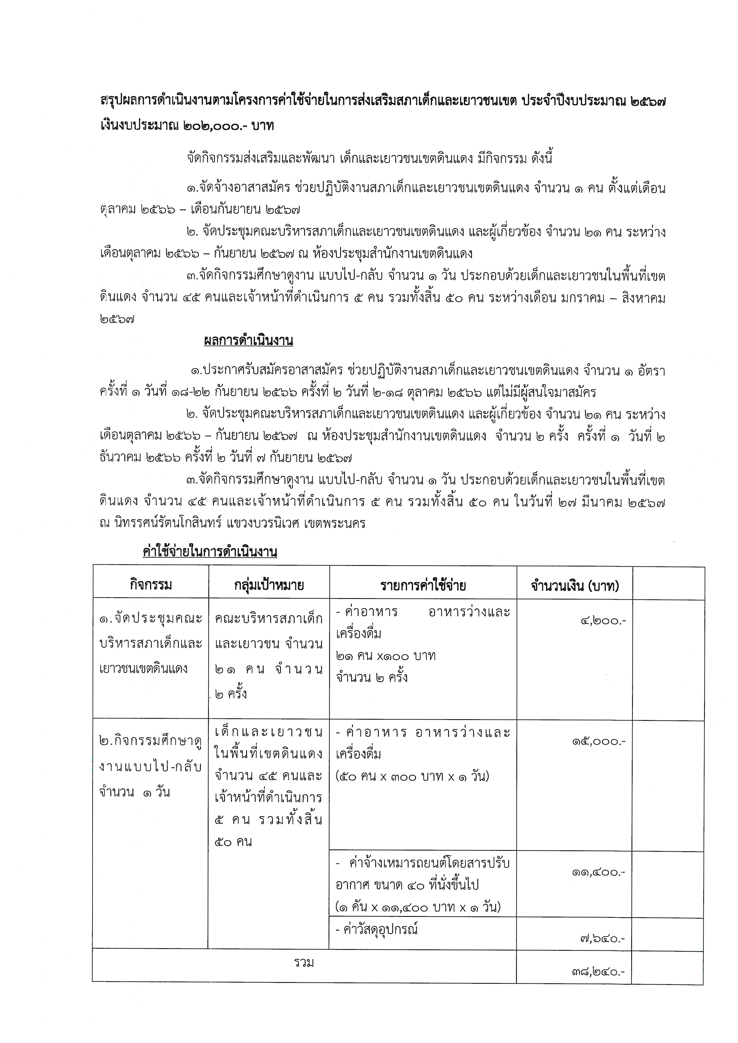 11-09-202410.00สรุปค่าใช้จ่ายในการดำเนินงาน 1. จัดประชุมคณะบริหารสภาเด็กและเยาวชนเขตดินแดง (1) ค่าอาหาร อาหารว่างและเครื่องดื่ม 21 คน คนละ 100 บาท จำนวน 2 ครั้ง เป็นเงิน 4,200 บาท 2. กิจกรรมศึกษาดูงานแบบไป-กลับ จำนวน 1 วัน (1) ค่าอาหาร อาหารว่างและเครื่องดื่ม 50 คน คนละ 300 บาท x 1 วัน เป็นเงิน 15,000 บาท (2) ค่าจ้างเหมารถโดยสารปรับอากาศ ขนาด 40 ที่นั่งขึ้นไป จำนวน 1 คัน เป็นเงิน 11,400 บาท (3) ค่าวัสดุอุปกรณ์ เป็นเงิน 7,640 บาท รวมเป็นใช้งบประมาณดำเนินการจำนวนทั้งสิ้น 38,240 บาท