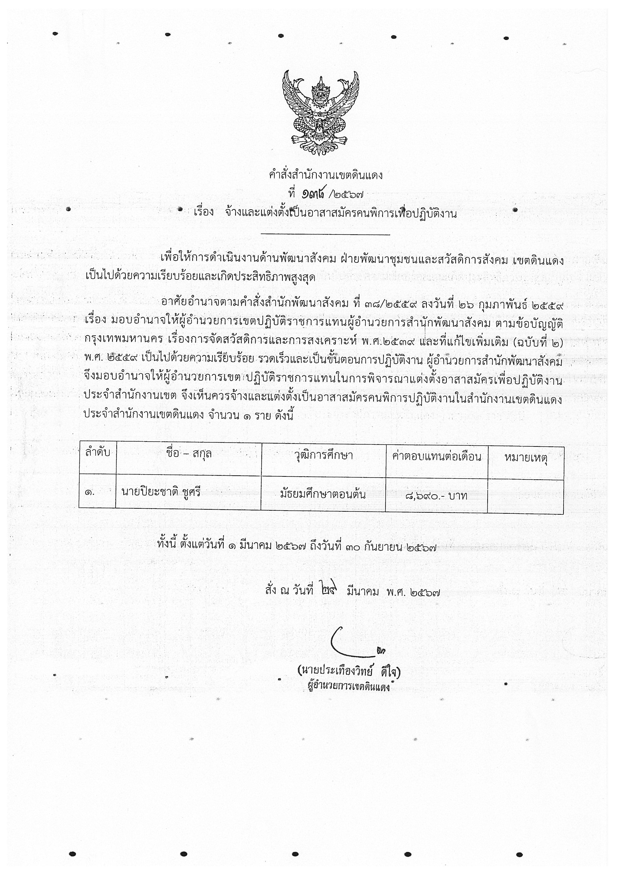 13-09-20240.00คำสั่งสำนักงานเขตดินแดงที่ 138/2567 ลงวันที่ 29 มีนาคม 2567 เรื่องจ้างและแต่งตั้งเป็นอาสาสมัครคนพิการเพื่อปฏิบัติงาน จำนวน 1 ราย