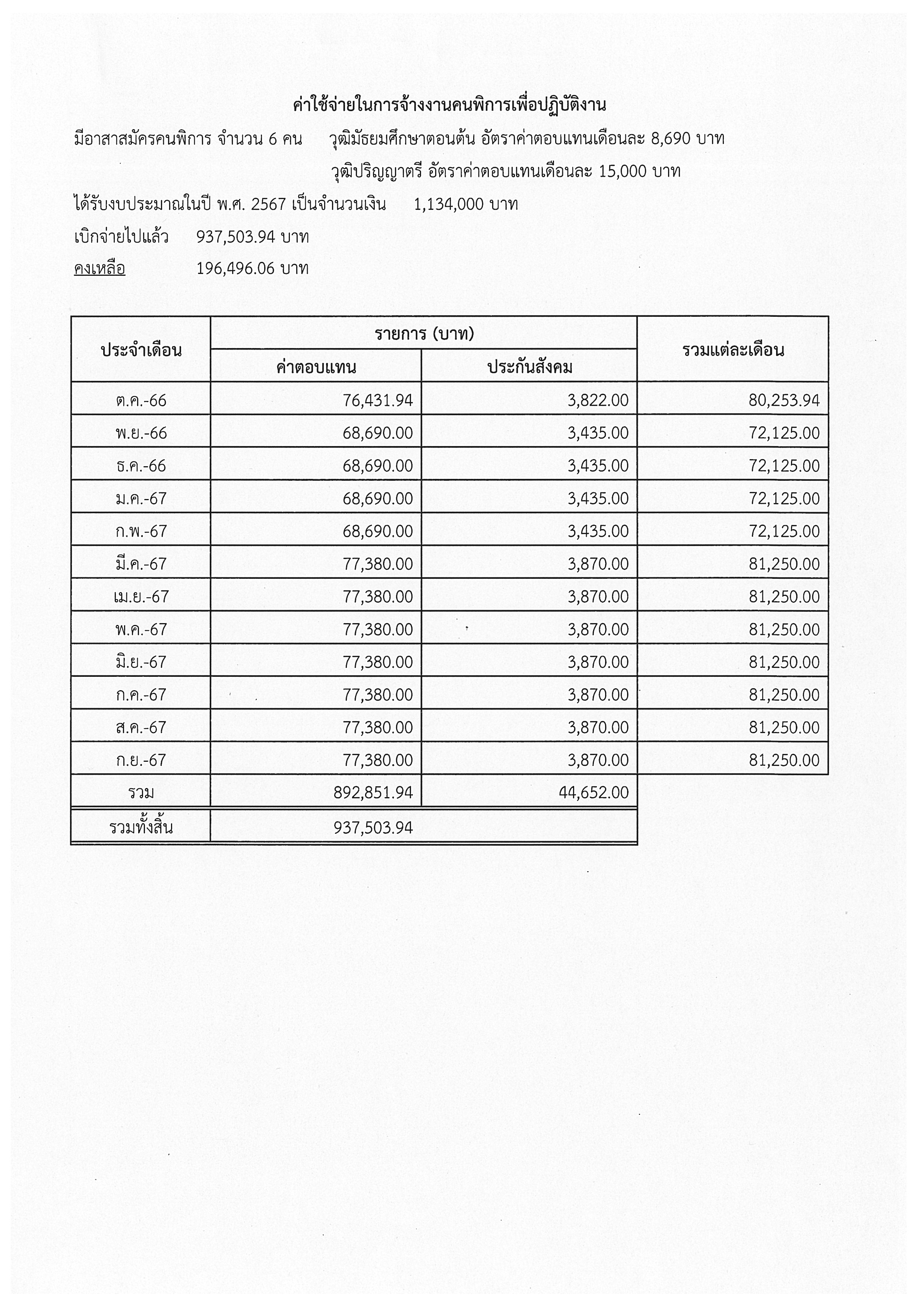 13-09-20240.00เบิกจ่ายตามโครงการค่าใช้จ่ายในการจ้างคนพิการเพื่อปฏิบัติงาน ในปีงบประมาณ พ.ศ. 2567 1. ค่าตอบแทน เป็นเงิน 892,851.94.-บาท 2. เงินสมทบประกันสังคม เป็นเงิน 44,652.-บาท รวมเป็นจำนวนเงินทั้งสิ้น 937,503.94.-บาท