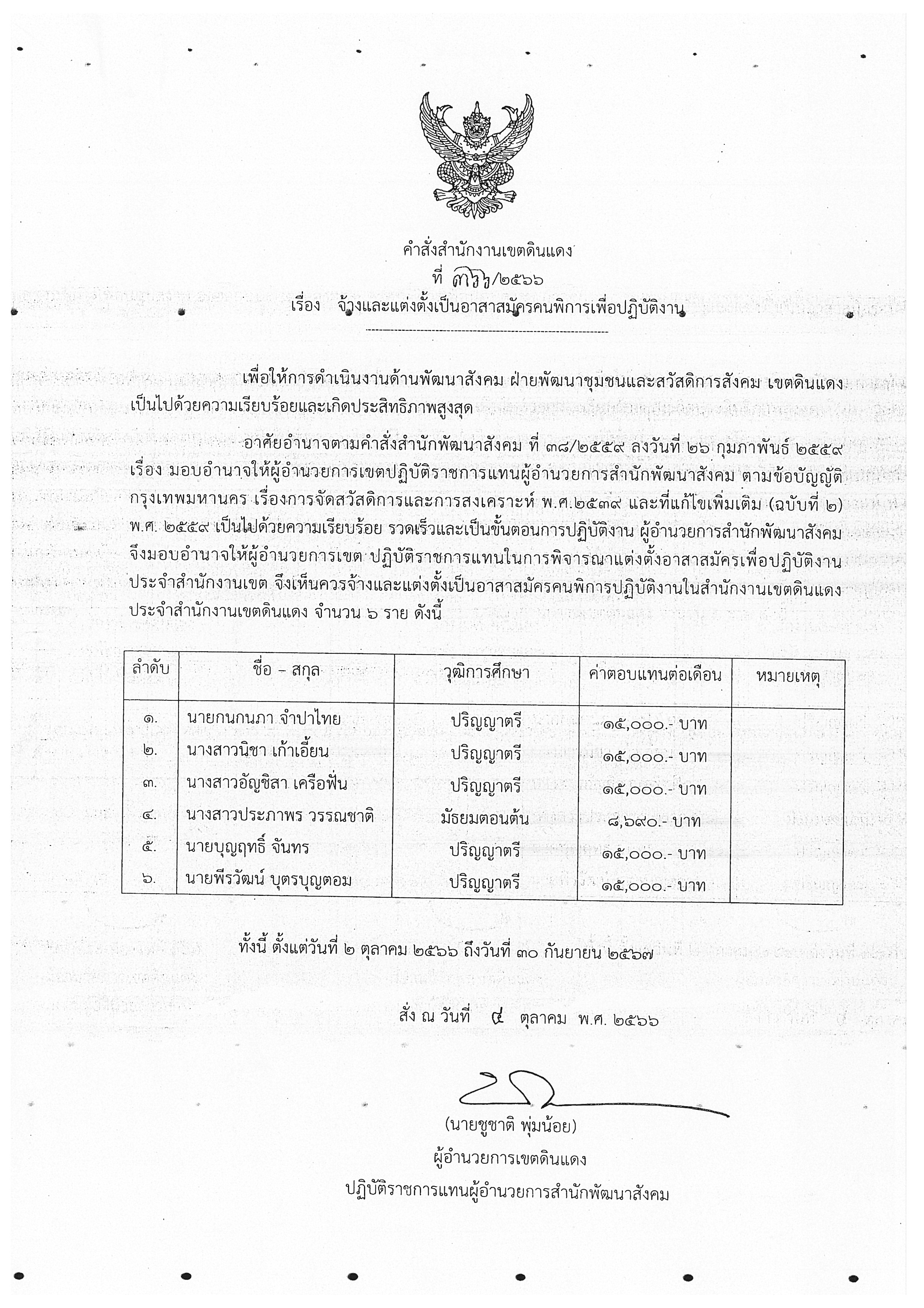 13-09-20240.00คำสั่งสำนักงานเขตดินแดงที่ 366/2566 ลงวันที่ 4 ตุลาคม 2566 เรื่องจ้างและแต่งตั้งเป็นอาสาสมัครคนพิการเพื่อปฏิบัติงาน จำนวน 6 ราย
