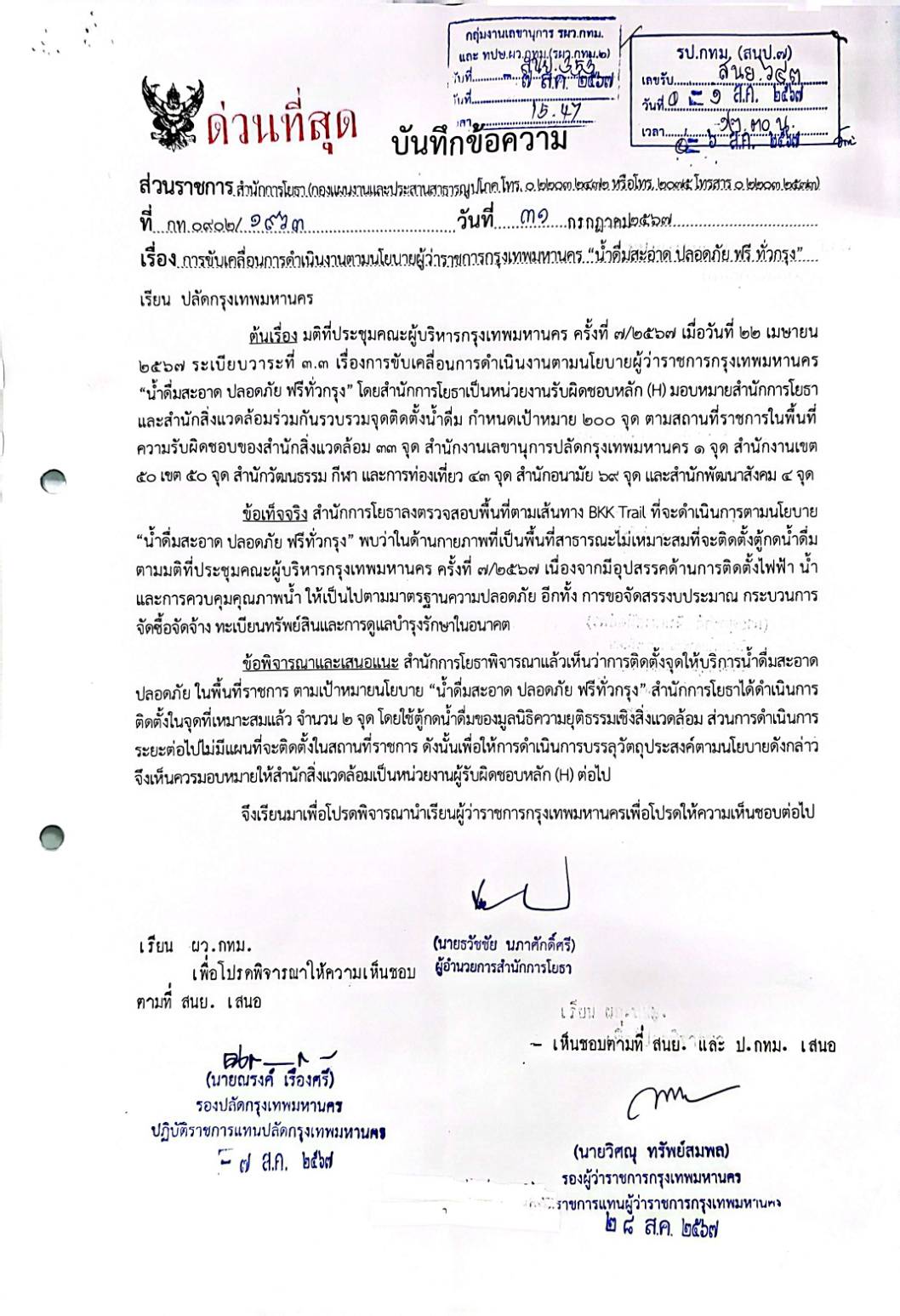30-07-20240.00อยู่ระหว่างเสนอหนังสือแจ้งพิกัดจุดติดตั้งตู้น้ำดื่มถึง สยป. จำนวน 2 จุด ที่ สนย. รับผิดชอบ และ สสล. ได้มีหนังสือประสานหน่วยงานที่เกี่ยวข้องรายงานผลจุดติดตั้งน้ำดื่ม จำนวน 200 จุด ตามมติที่ประชุมผู้บริหารกรุงเทพมหานคร ครั้งที่ 7/2567 รายงานผลจำนวน 2 ครั้ง ได้แก่วันที่ 1 ก.ค. 2567 และ 1 ต.ค. 2567
