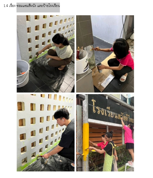 27-12-20231.00โรงเรียนสวัสดีวิทยา ดำเนินการดังนี้ 1. ปรับปรุงฉากเวที และบอร์ดประชาสัมพันธ์ของโรงเรียน 2. ฉีดล้างทำความสะอาด ซ่อมแซมอุปกรณ์ภายในห้องน้ำนักเรียน 3. ซ่อมแซมสีผนัง และป้ายโรงเรียน 4. เทพื้น ทากันซึมระเบียงและหลังคาอาคารเรียน 5. ฉีดล้างทำ