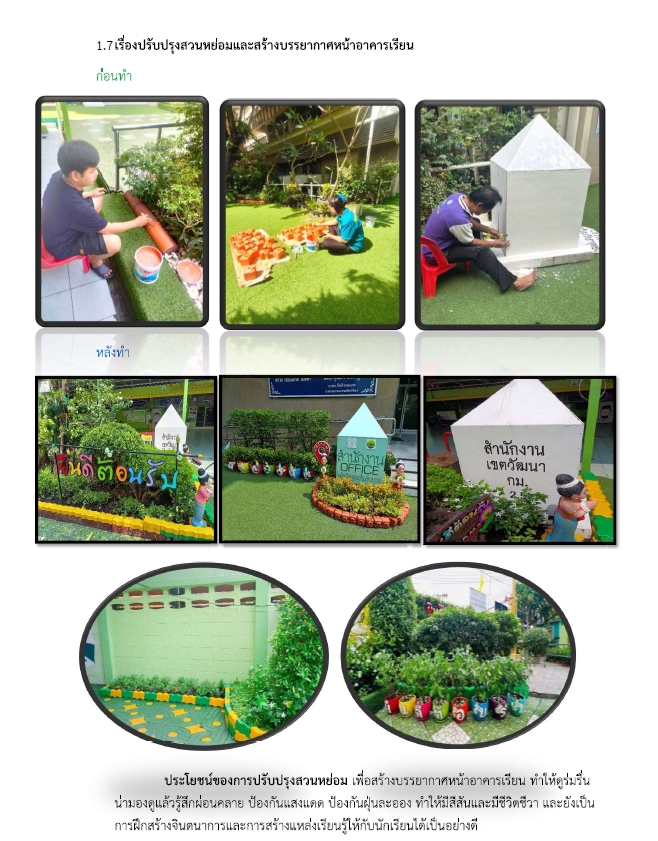 29-02-20241.00โรงเรียนวัดธาตุทอง(เรือนเขียวสะอาด) ดำเนินการดังนี้ 1. ปรับปรุงสวนหย่อมและสร้างบรรยากาศหน้าอาคารเรียน 2. ซ่อมแซมสนามเด็กเล่นจากพื้นซีเมนต์ธรรมดาเป็นปูพื้นหญ้าเทียม 3. ปรับปรุงสภาพแวดล้อมในโรงเรียนทางเดินไปห้องน้ำ 4. ซ่อมแซมและปรับปรุงภูมิทัศน์โรงอาหาร
