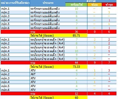 ![]() | 22-11-2024 | 0.00 | ![]() | 22 พฤศจิกายน 2567 รถจักรยานยนต์ดับเพลิง จำนวนทั้งหมด 42 คัน พร้อมใช้ 36 คัน ซ่อม 0 คัน ชำรุด 6 คัน ใช้งานได้ร้อยละ 85.71 รถดับเพลิง(ดีเซล) ขนาด 1 ตัน ชนิด (4x4) พร้อมเครื่องสูบน้ำแบกหาม จำนวนทั้งหมด 60 คัน พร้อมใช้ 44 คัน ซ่อม 9 คัน ชำรุด 7 คัน ใช้งานได้ร้อยละ 73.33 รถบรรเทาสาธารณภัย (ATV) จำนวนทั้งหมด 20 คันพร้อมใช้ 12 คัน ซ่อม 4 คัน ชำรุด 4 คัน ใช้งานได้ร้อยละ 60 เฉลี่ยใช้งานได้ร้อยละ 75.41 | |