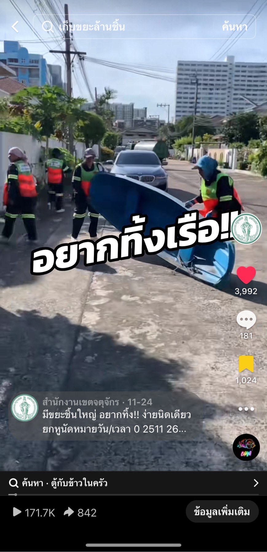 | 03-12-2024 | 1.00 |  | สำนักงานเขตจตุจักร ดำเนินการผลิตสื่อประชาสัมพันธ์ ประเภท คลิปวิดีโอสั้น “มีขยะชิ้นใหญ่ อยากทิ้ง ง่ายนิดเดียว" เผยแพร่ผ่านแพลตฟอร์ม TikTok เมื่อวันที่ 24 พฤศจิกายน 2567 | |