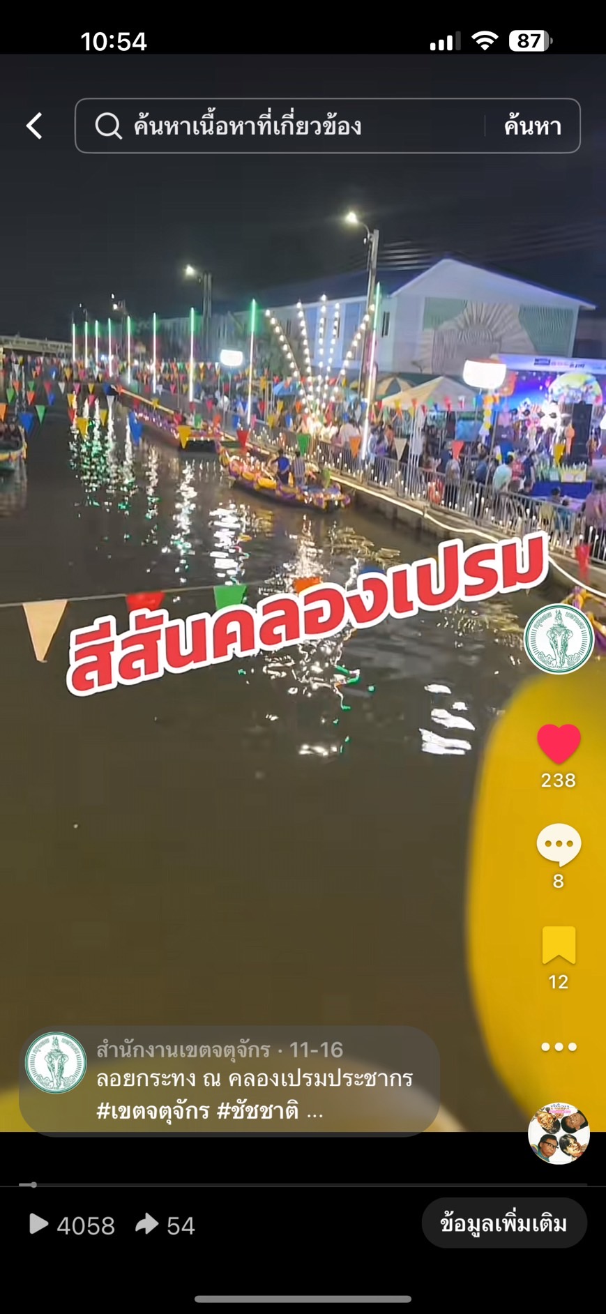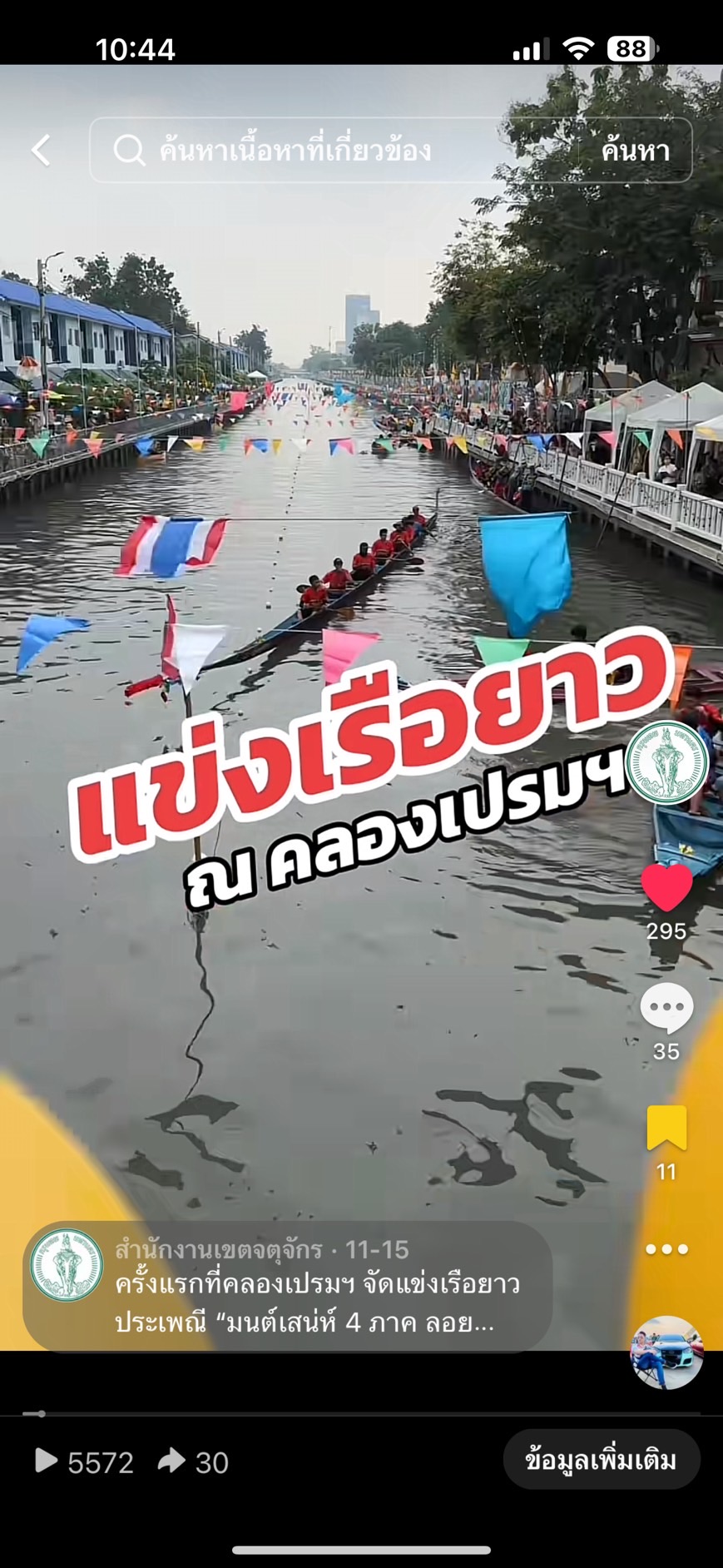 | 03-12-2024 | 1.00 |  | สำนักงานเขตจตุจักร ดำเนินการผลิตสื่อประชาสัมพันธ์ ประเภท คลิปวิดีโอสั้น “แข่งเรือยาวประเพณี" ณ คลองเปรมประชากร ในงานลอยกระทง ประจำปี 2567 เผยแพร่ผ่านแพลตฟอร์ม TikTok เมื่อวันที่ 15 พฤศจิกายน 2567 | |