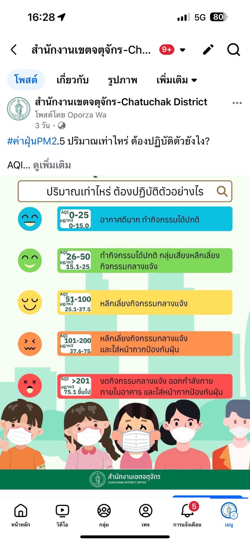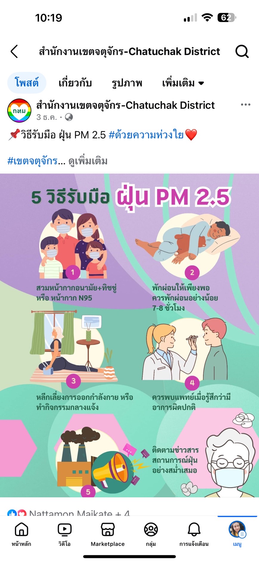 | 13-12-2024 | 1.00 |  | สำนักงานเขตจตุจักร ดำเนินการผลิตสื่อประชาสัมพันธ์ ประเภท อินโฟกราฟิกส์ วิธีรับมือ ฝุ่น PM 2.5 เผยแพร่ผ่านแพลตฟอร์ม Facebook Fanpage สำนักงานเขตจตุจักร Chatuchak District เมื่อวันที่ 3 ธันวาคม 2567 | |