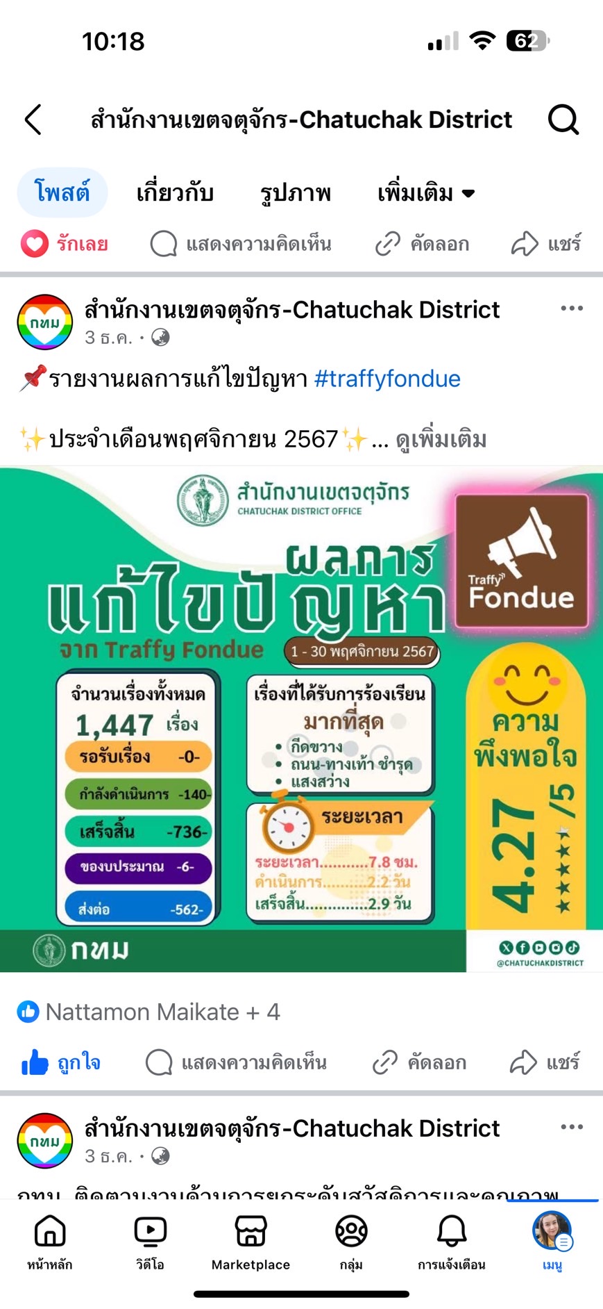 | 13-12-2024 | 1.00 |  | สำนักงานเขตจตุจักร จัดทำสื่อประชาสัมพันธ์ อินโฟกราฟิกส์ รายงานผลการแก้ไขปัญหาข้อร้องเรียน Traffy Fondue ประจำเดือนพฤศจิกายน 2567 เผยแพร่บนสื่อสังคมออนไลน์ Facebook Fanpage สำนักงานเขตจตุจักร-Chatuchak district เมื่อวันที่ 3 ธันวาคม 2567 | |