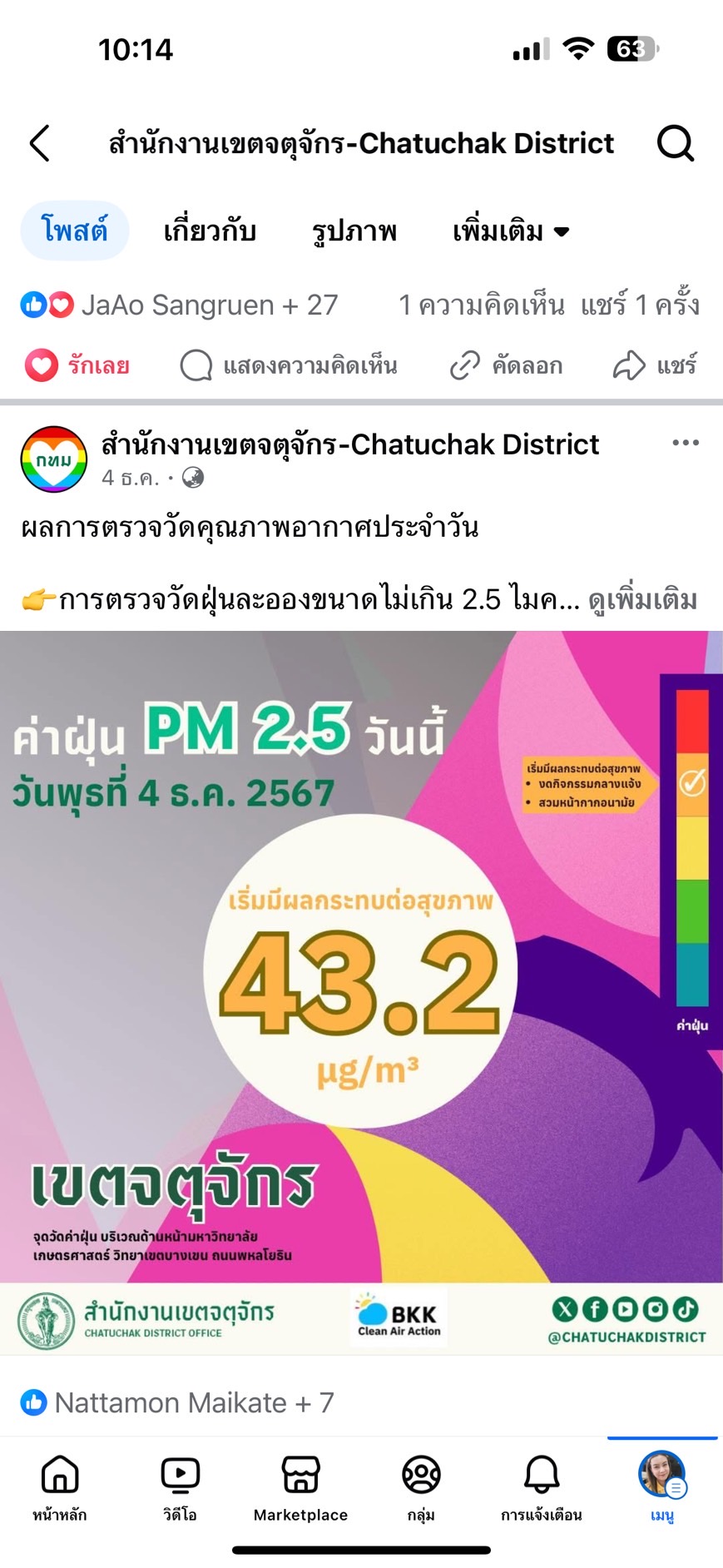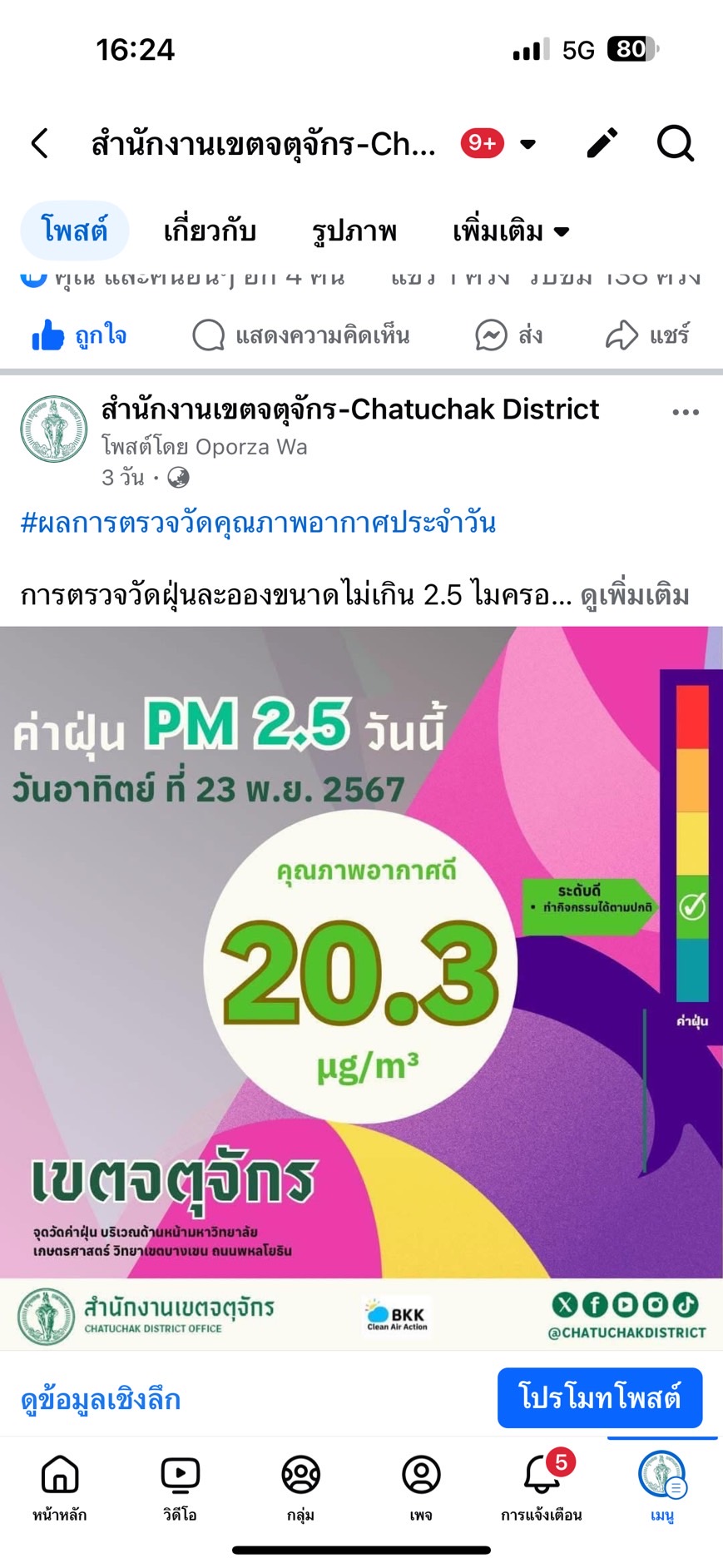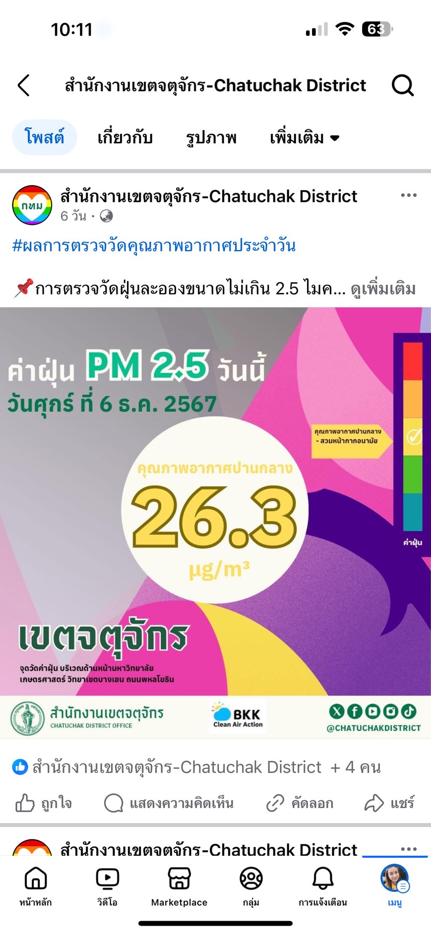 | 27-11-2024 | 1.00 |  | สำนักงานเขตจตุจักร จัดทำสื่อประชาสัมพันธ์ อินโฟกราฟิกส์ รายงานผลการตรวจวัดคุณภาพอากาศ ประจำวันอาทิตย์ที่ 23 พ.ย.67 เผยแพร่บนสื่อสังคมออนไลน์ Facebook Fanpage สำนักงานเขตจตุจักร-Chatuchak district | |