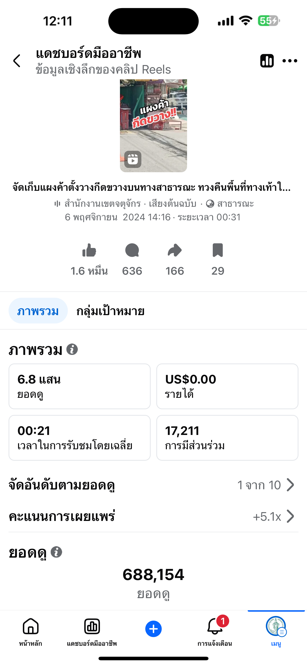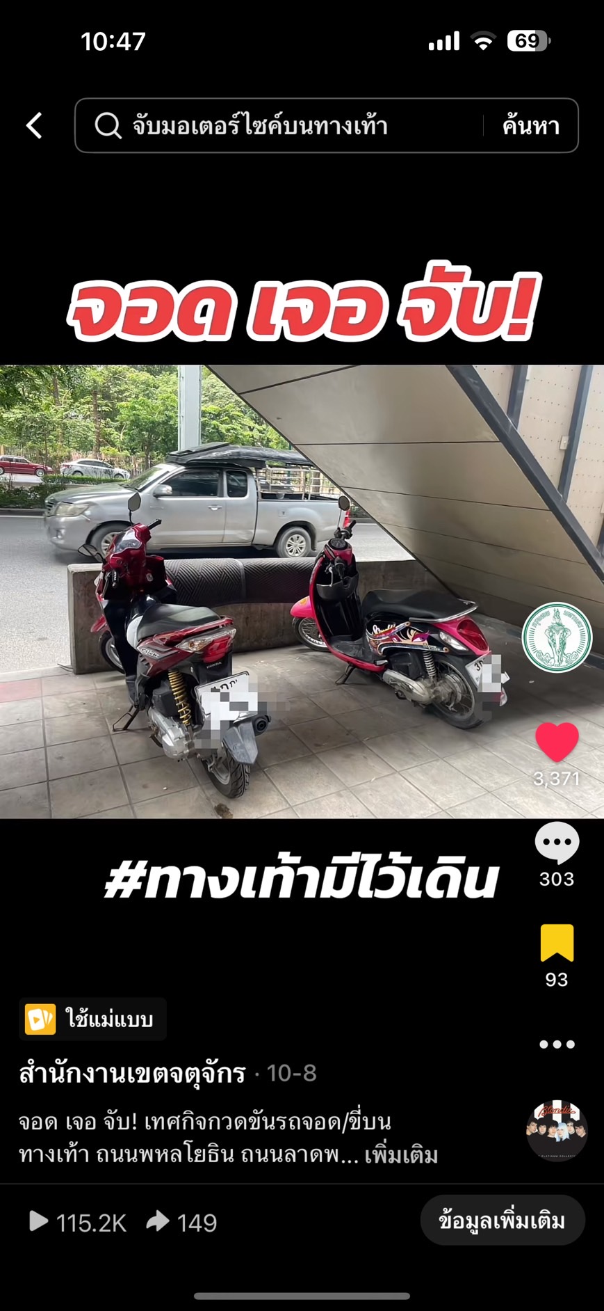 | 25-11-2024 | 1.00 |  | สำนักงานเขตจตุจักร ดำเนินการผลิตสื่อประชาสัมพันธ์ ประเภท คลิปวิดีโอสั้น “เจอ จอด จับ” ทางเท้ามีไว้เดิน เผยแพร่ผ่านแพลตฟอร์ม TikTok เมื่อวันที่ 8 ตุลาคม 2567