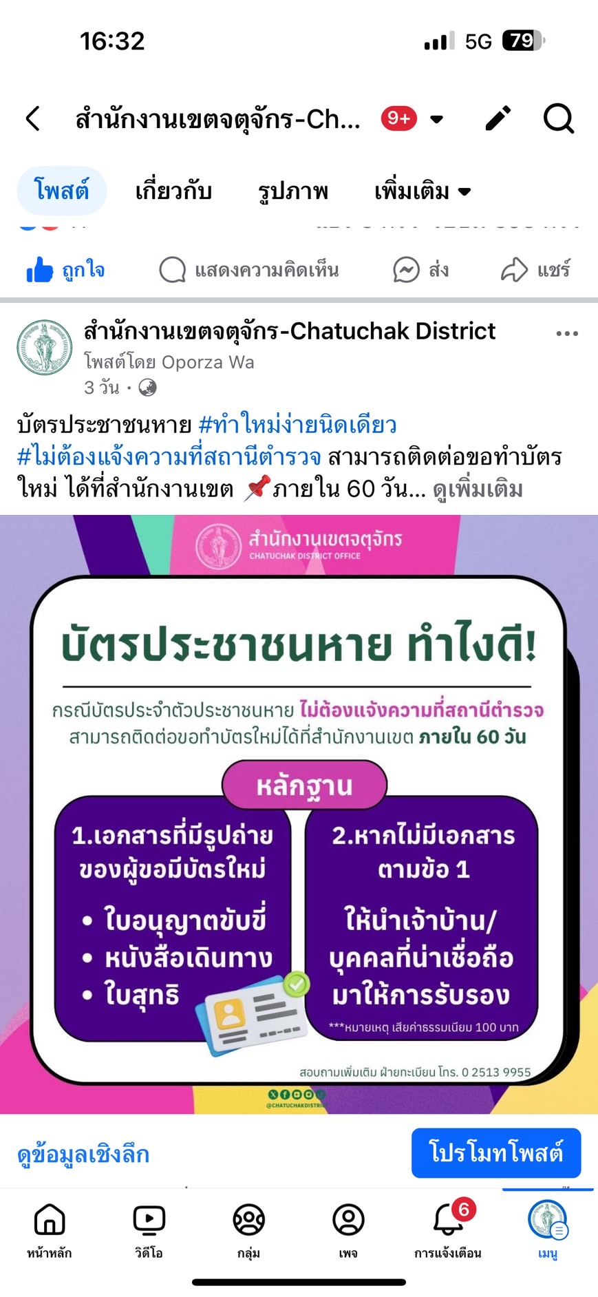 | 27-11-2024 | 1.00 |  | สำนักงานเขตจตุจักร จัดทำสื่อประชาสัมพันธ์ อินโฟกราฟิกส์ ขั้นตอนการให้บริการประชาชน ในการขอทำบัตรประชาชนใหม่ (กรณีบัตรหาย) ผยแพร่บนสื่อสังคมออนไลน์ Facebook Fanpage สำนักงานเขตจตุจักร-Chatuchak district เมื่อวันอาทิตย์ที่ 23 พ.ย.67 | |
