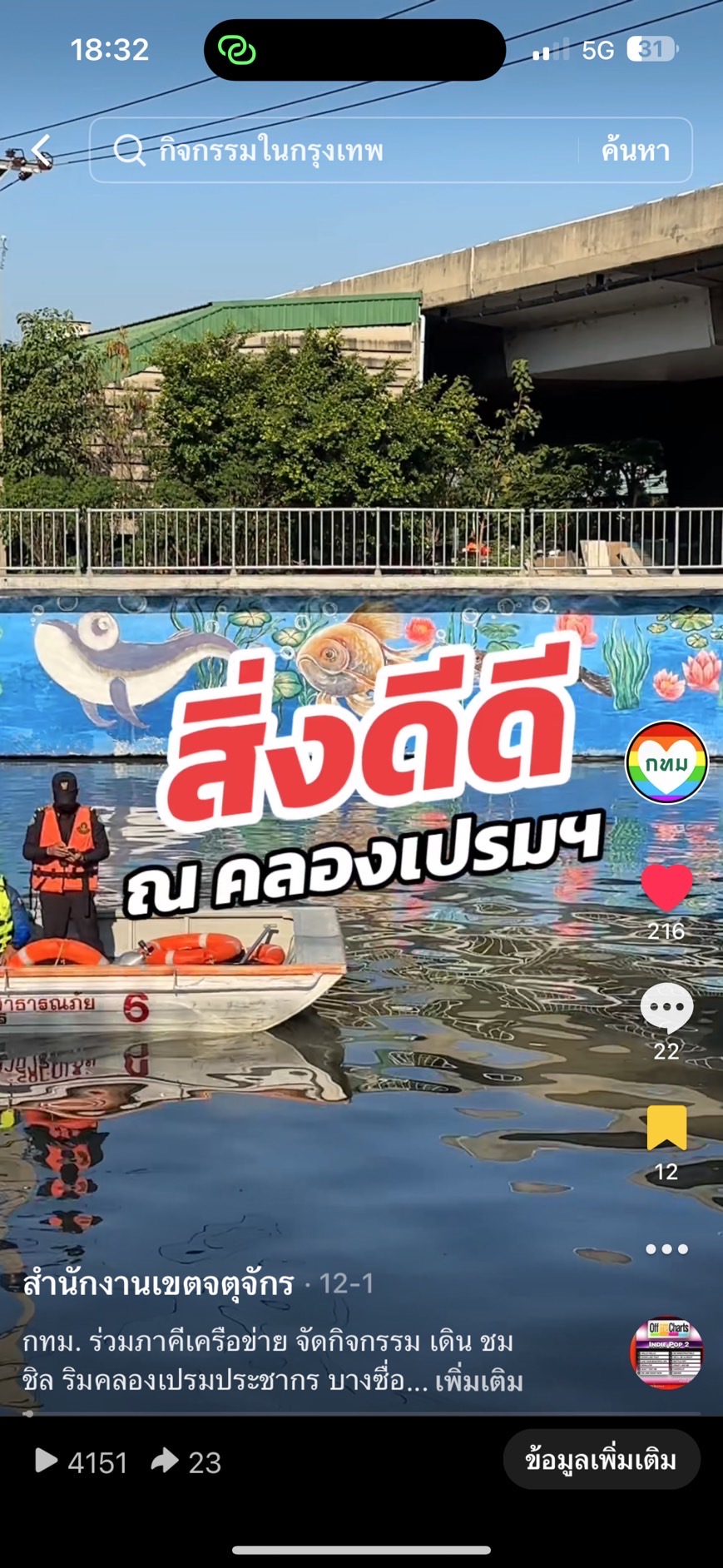 | 12-12-2024 | 1.00 |  | สำนักงานเขตจตุจักร ดำเนินการผลิตสื่อประชาสัมพันธ์ ประเภท คลิปวิดีโอสั้น สิ่งดีดี ณ คลองเปรมฯ กทม. ร่วมภาคีเครือข่ายจัดกิจกรรม เดิน ชม ชิล ริมคลองเปรมประชากร เผยแพร่ผ่านแพลตฟอร์ม TikTok เมื่อวันที่ 1 ธันวาคม 2567 | |