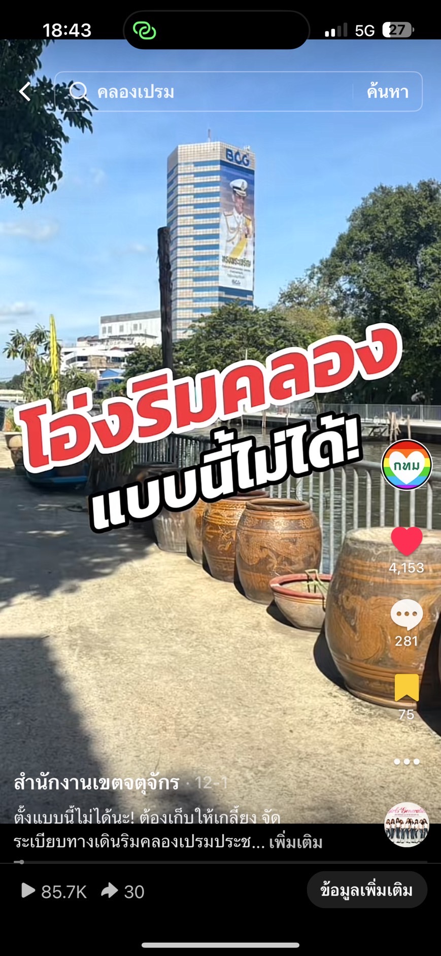 | 12-12-2024 | 1.00 |  | สำนักงานเขตจตุจักร ดำเนินการผลิตสื่อประชาสัมพันธ์ ประเภท คลิปวิดีโอสั้นโอ่งริมคลอง….แบบนี้ไม่ได้ จัดระเบียบทางเดิน ริมคลองเปรมประชากร เผยแพร่ผ่านแพลตฟอร์ม TikTok เมื่อวันที่ 1 ธันวาคม 2567 | |