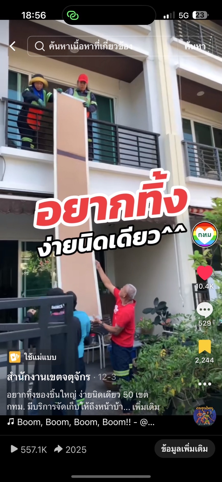 | 12-12-2024 | 1.00 |  | สำนักงานเขตจตุจักร ดำเนินการผลิตสื่อประชาสัมพันธ์ ประเภท คลิปวิดีโอสั้น อยากทิ้งของชิ้นใหญ่ ง่ายนิดเดียว เผยแพร่ผ่านแพลตฟอร์ม TikTok เมื่อวันที่ 3 ธันวาคม 2567 | |