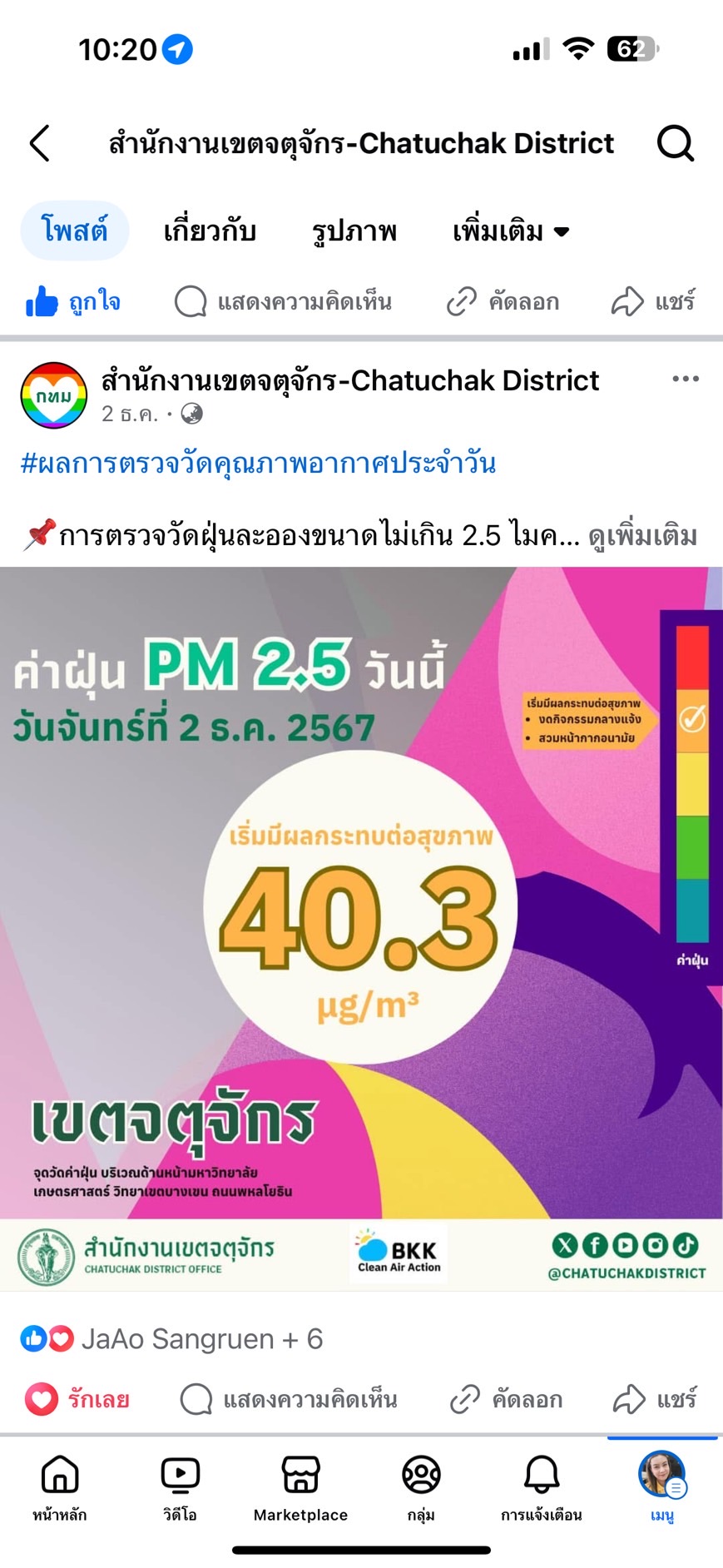 | 13-12-2024 | 1.00 |  | สำนักงานเขตจตุจักร ดำเนินการผลิตสื่อประชาสัมพันธ์ ประเภท อินโฟกราฟิกส์ รายงานสถานการณ์ฝุ่น PM 2.5 เผยแพร่ผ่านแพลตฟอร์ม Facebook Fanpage สำนักงานเขตจตุจักร Chatuchak District เมื่อวันที่ 2 ธันวาคม 2567 | |