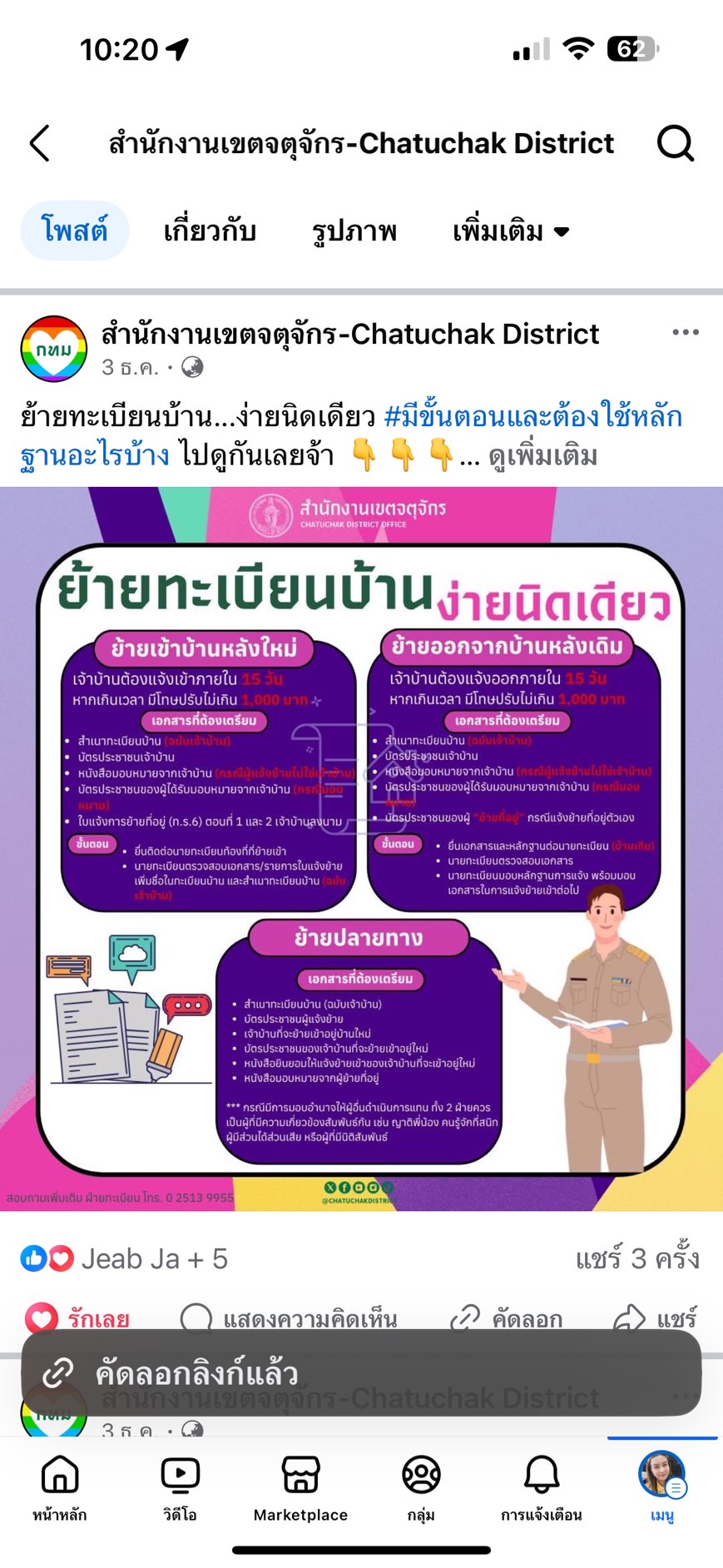 | 13-12-2024 | 1.00 |  | สำนักงานเขตจตุจักร ดำเนินการผลิตสื่อประชาสัมพันธ์ ประเภท อินโฟกราฟิกส์ การให้บริการงานทะเบียน ย้ายทะเบียนบ้าน ง่ายนิดเดียว เผยแพร่ผ่านแพลตฟอร์ม Facebook Fanpage สำนักงานเขตจตุจักร Chatuchak District เมื่อวันที่ 3 ธันวาคม 2567 | |