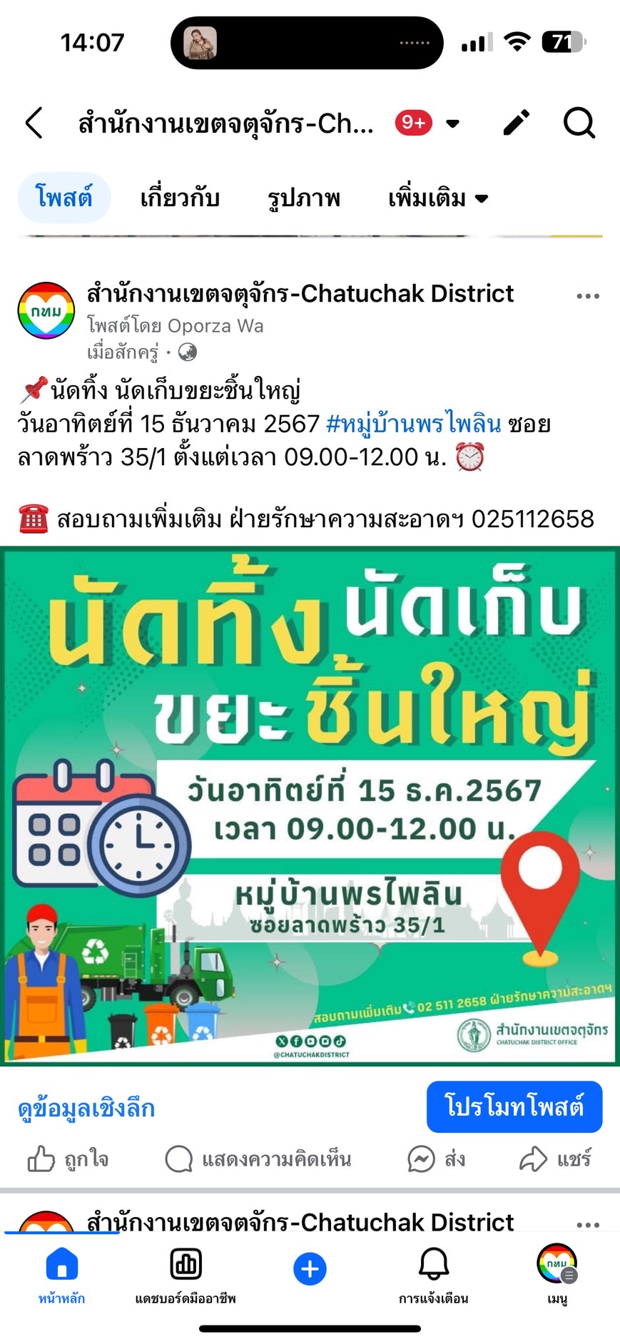 | 07-01-2025 | 1.00 |  | สำนักงานเขตจตุจักร ดำเนินการผลิตสื่อประชาสัมพันธ์ ประเภท อินโฟกราฟิกส์ กำหนดวันทิ้งของชิ้นใหญ่และขยะอันตราย เผยแพร่ผ่านแพลตฟอร์ม Facebook Fanpage เมื่อวันที่ 3 มกราคม 2568 | |