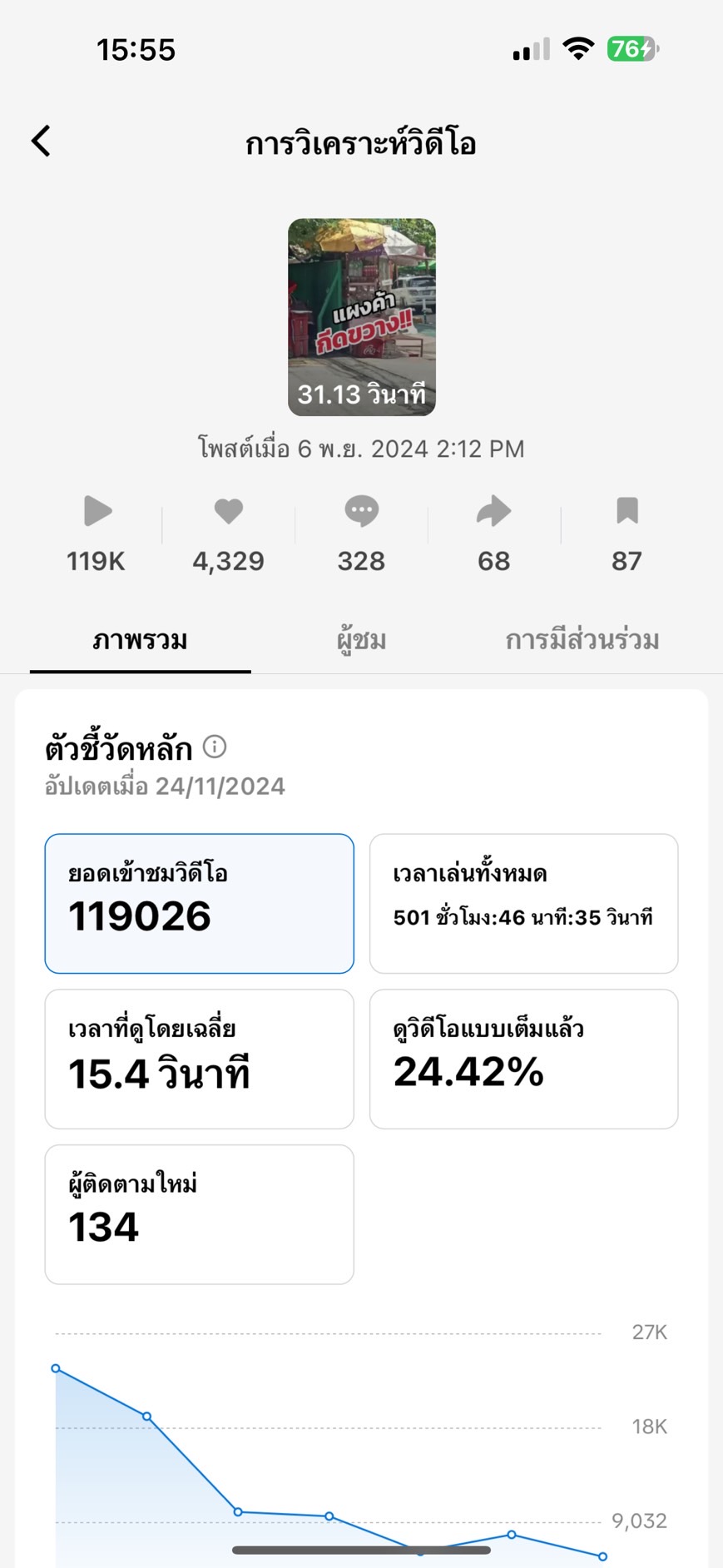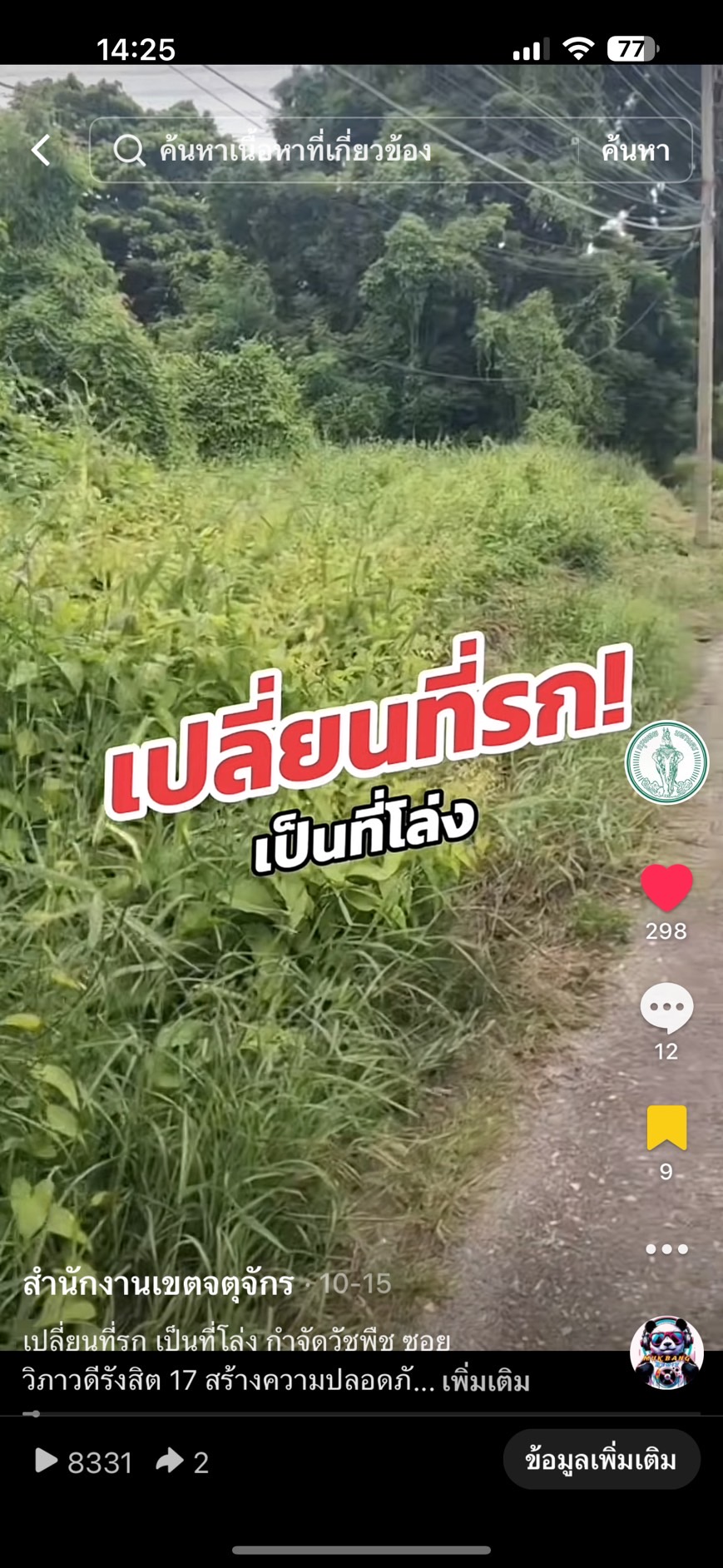 | 26-11-2024 | 1.00 |  | สำนักงานเขตจตุจักร ดำเนินการผลิตสื่อประชาสัมพันธ์ ประเภท คลิปวิดีโอสั้น “เปลี่ยนที่รก เป็นที่โล่ง” กำจัดวัชพืช ซอยวิภาวดีรังสิต 17 เผยแพร่ผ่านแพลตฟอร์ม TikTok เมื่อวันที่ 15 ตุลาคม 2567 | |