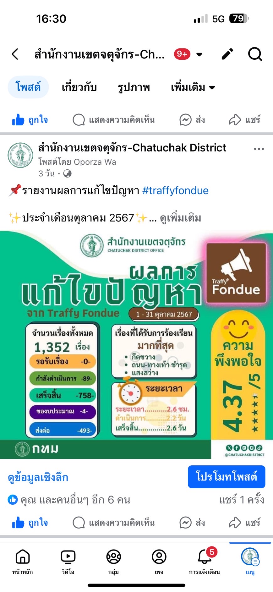 | 27-11-2024 | 1.00 |  | สำนักงานเขตจตุจักร จัดทำสื่อประชาสัมพันธ์ อินโฟกราฟิกส์ รายงานผลการแก้ไขปัญหาข้อร้องเรียน Traffy Fondue ประจำเดือนตุลาคม 2567 เผยแพร่บนสื่อสังคมออนไลน์ Facebook Fanpage สำนักงานเขตจตุจักร-Chatuchak district เมื่อวันอาทิตย์ที่ 23 พ.ย.67 | |