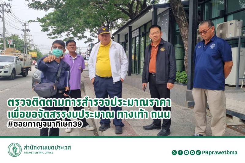 29-03-20240.00นายดิชา คงศรี ผู้อำนวยการเขตประเวศ พร้อมด้วย หัวหน้าฝ่ายโยธาลงพื้นที่ตรวจติดตามการดำเนินการสำรวจประมาณราคาเพื่อขอจัดสรรงบประมาณปรับปรุง ทางเท้าและถนนชำรุด ณ บริเวณ ซอยกาญจนาภิเษก39 แขวงดอกไม้ เขตประเวศ ทั้งนี้ เพื่อความปลอดภัยในชีวิตและทรัพย์สินของประชาชน