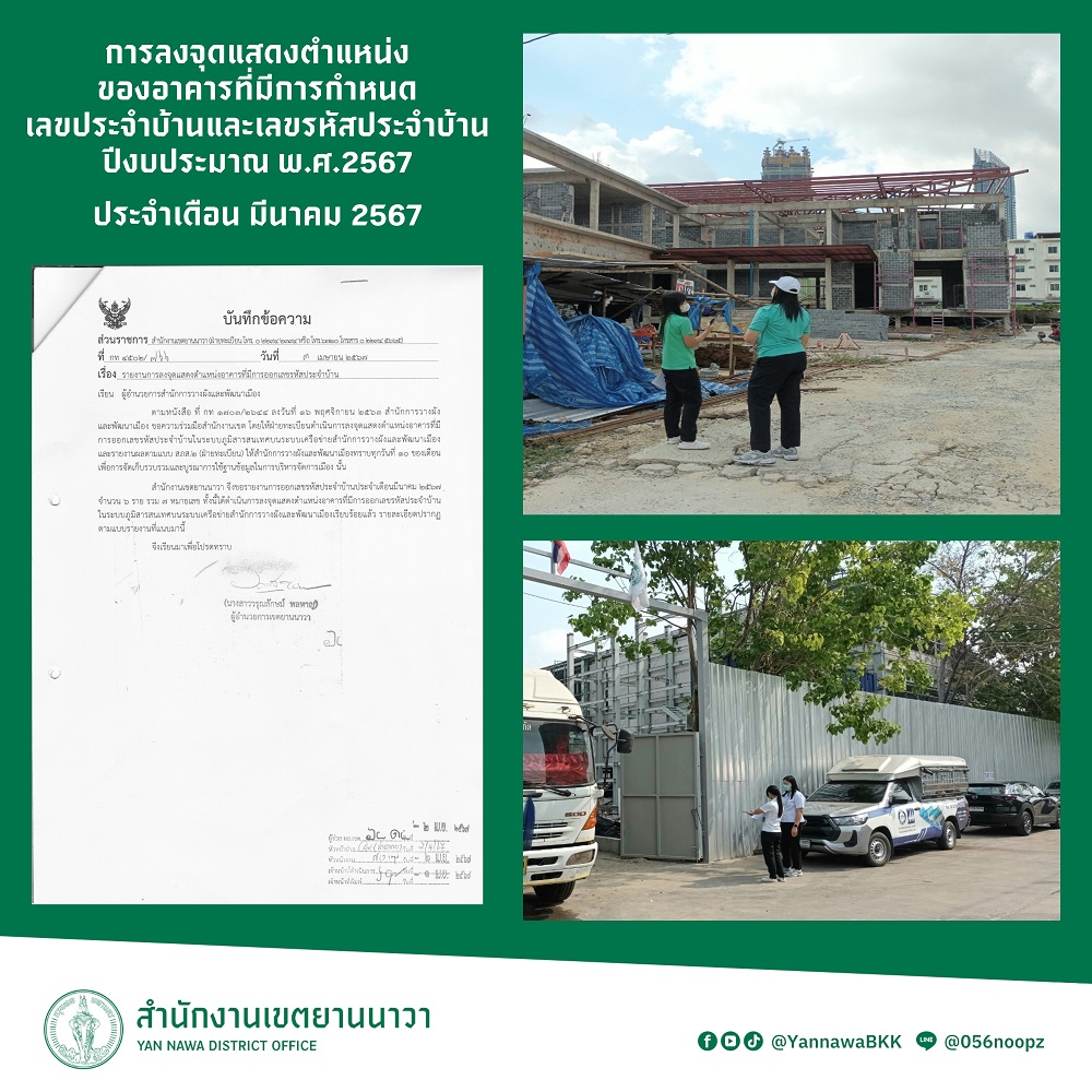 7 | ลงจุดแสดงตำแหน่งของอาคารที่มีการกำหนดเลขประจำบ้านและเลขรหัสประจำบ้าน ประจำเดือนมีนาคม 2567 | 7.00 | 01-03-2024 | 31-03-2024 |