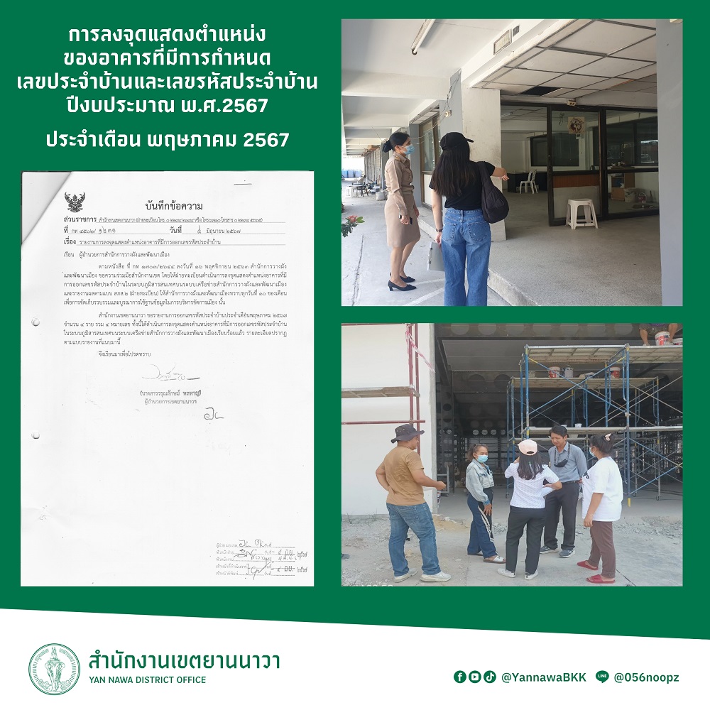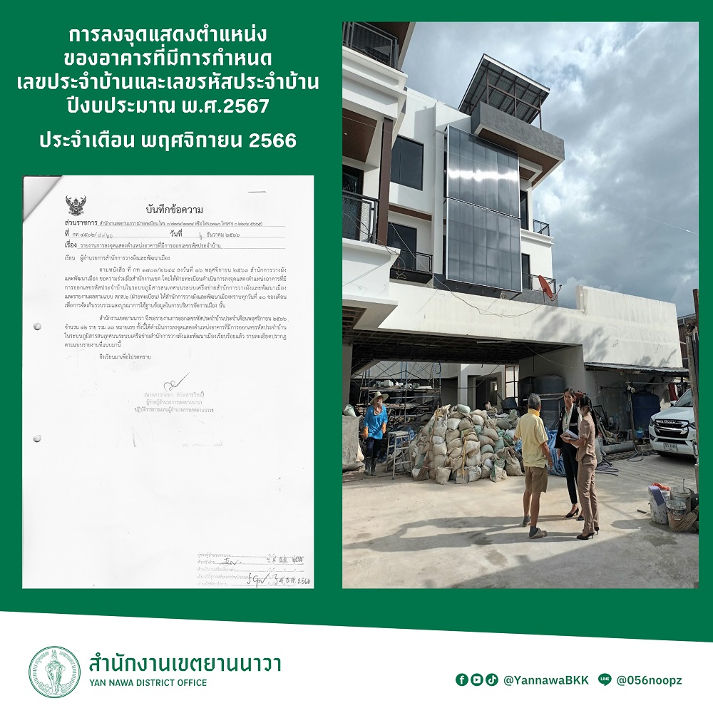 3 | ลงจุดแสดงตำแหน่งของอาคารที่มีการกำหนดเลขประจำบ้านและเลขรหัสประจำบ้าน ประจำเดือนพฤศจิกายน 2566 | 7.00 | 01-11-2323 | 30-11-2323 |