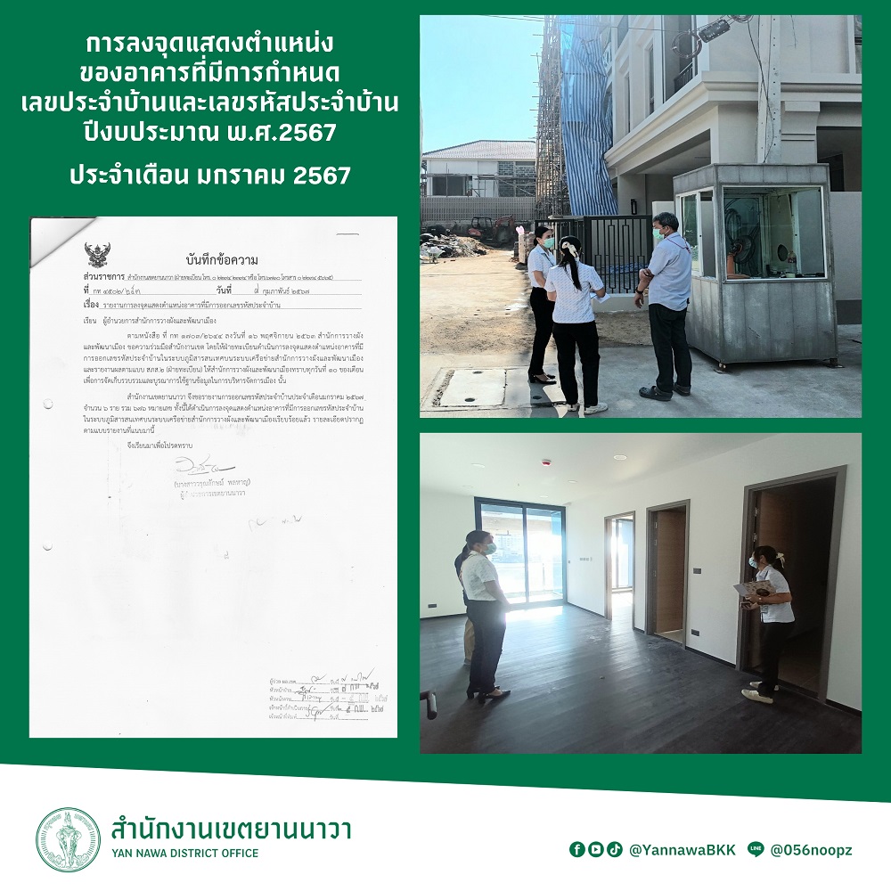 5 | ลงจุดแสดงตำแหน่งของอาคารที่มีการกำหนดเลขประจำบ้านและเลขรหัสประจำบ้าน ประจำเดือนมกราคม 2567 | 7.00 | 01-01-2024 | 31-01-2024 |