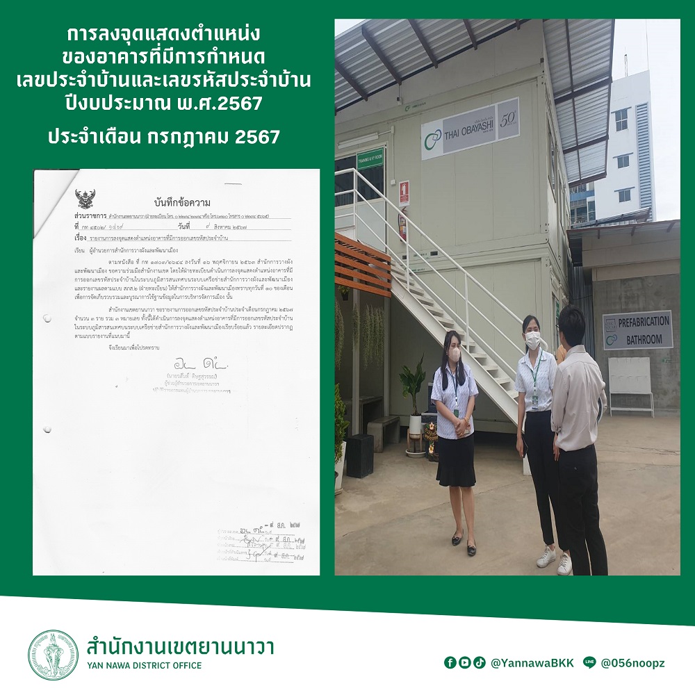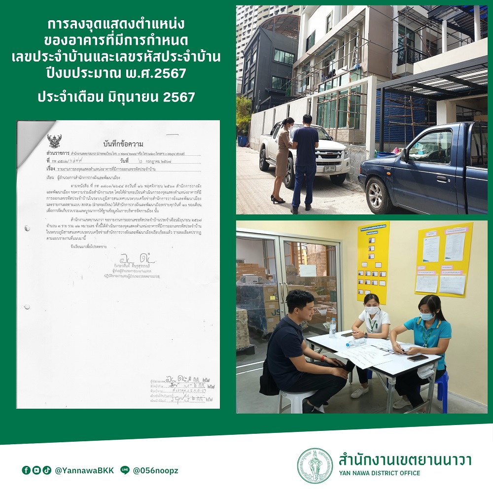 10 | ลงจุดแสดงตำแหน่งของอาคารที่มีการกำหนดเลขประจำบ้านและเลขรหัสประจำบ้าน ประจำเดือนมิถุนายน 2567 | 9.00 | 01-06-2424 | 30-06-2424 |